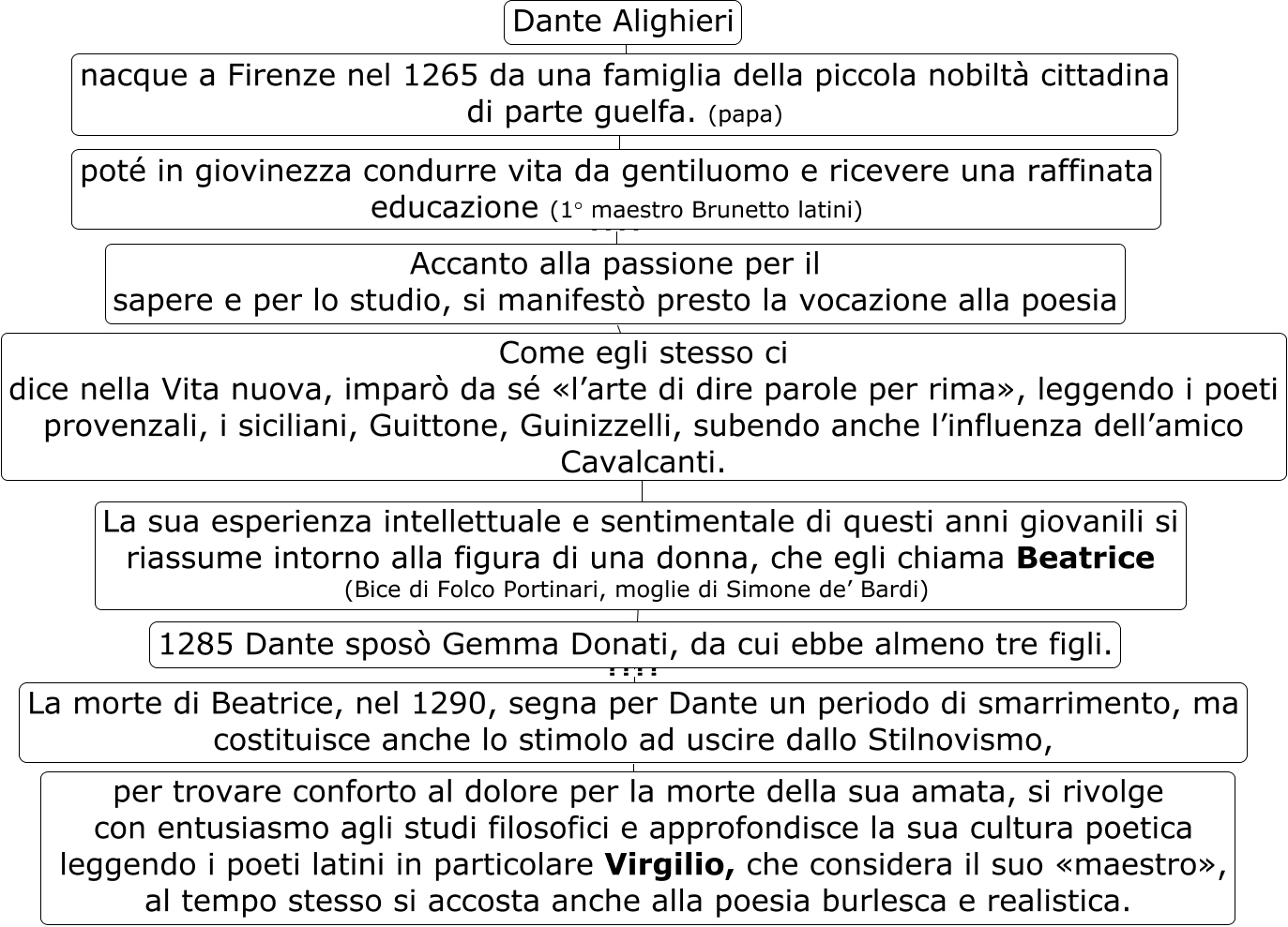 Questa Cmap, creata con IHMC CmapTools, contiene informazioni relative a: 149, Accanto alla passione per il sapere e per lo studio, si manifestò presto la vocazione alla poesia ???? Come egli stesso ci dice nella Vita nuova, imparò da sé «l’arte di dire parole per rima», leggendo i poeti provenzali, i siciliani, Guittone, Guinizzelli, subendo anche l’influenza dell’amico Cavalcanti., Dante Alighieri ???? nacque a Firenze nel 1265 da una famiglia della piccola nobiltà cittadina di parte guelfa. (papa), 1285 Dante sposò Gemma Donati, da cui ebbe almeno tre figli. ???? La morte di Beatrice, nel 1290, segna per Dante un periodo di smarrimento, ma costituisce anche lo stimolo ad uscire dallo Stilnovismo,, La sua esperienza intellettuale e sentimentale di questi anni giovanili si riassume intorno alla figura di una donna, che egli chiama Beatrice (Bice di Folco Portinari, moglie di Simone de’ Bardi) ???? 1285 Dante sposò Gemma Donati, da cui ebbe almeno tre figli., nacque a Firenze nel 1265 da una famiglia della piccola nobiltà cittadina di parte guelfa. (papa) ???? poté in giovinezza condurre vita da gentiluomo e ricevere una raffinata educazione (1° maestro Brunetto latini), poté in giovinezza condurre vita da gentiluomo e ricevere una raffinata educazione (1° maestro Brunetto latini) ???? Accanto alla passione per il sapere e per lo studio, si manifestò presto la vocazione alla poesia, Come egli stesso ci dice nella Vita nuova, imparò da sé «l’arte di dire parole per rima», leggendo i poeti provenzali, i siciliani, Guittone, Guinizzelli, subendo anche l’influenza dell’amico Cavalcanti. ???? La sua esperienza intellettuale e sentimentale di questi anni giovanili si riassume intorno alla figura di una donna, che egli chiama Beatrice (Bice di Folco Portinari, moglie di Simone de’ Bardi), La morte di Beatrice, nel 1290, segna per Dante un periodo di smarrimento, ma costituisce anche lo stimolo ad uscire dallo Stilnovismo, ???? per trovare conforto al dolore per la morte della sua amata, si rivolge con entusiasmo agli studi filosofici e approfondisce la sua cultura poetica leggendo i poeti latini in particolare Virgilio, che considera il suo «maestro», al tempo stesso si accosta anche alla poesia burlesca e realistica.