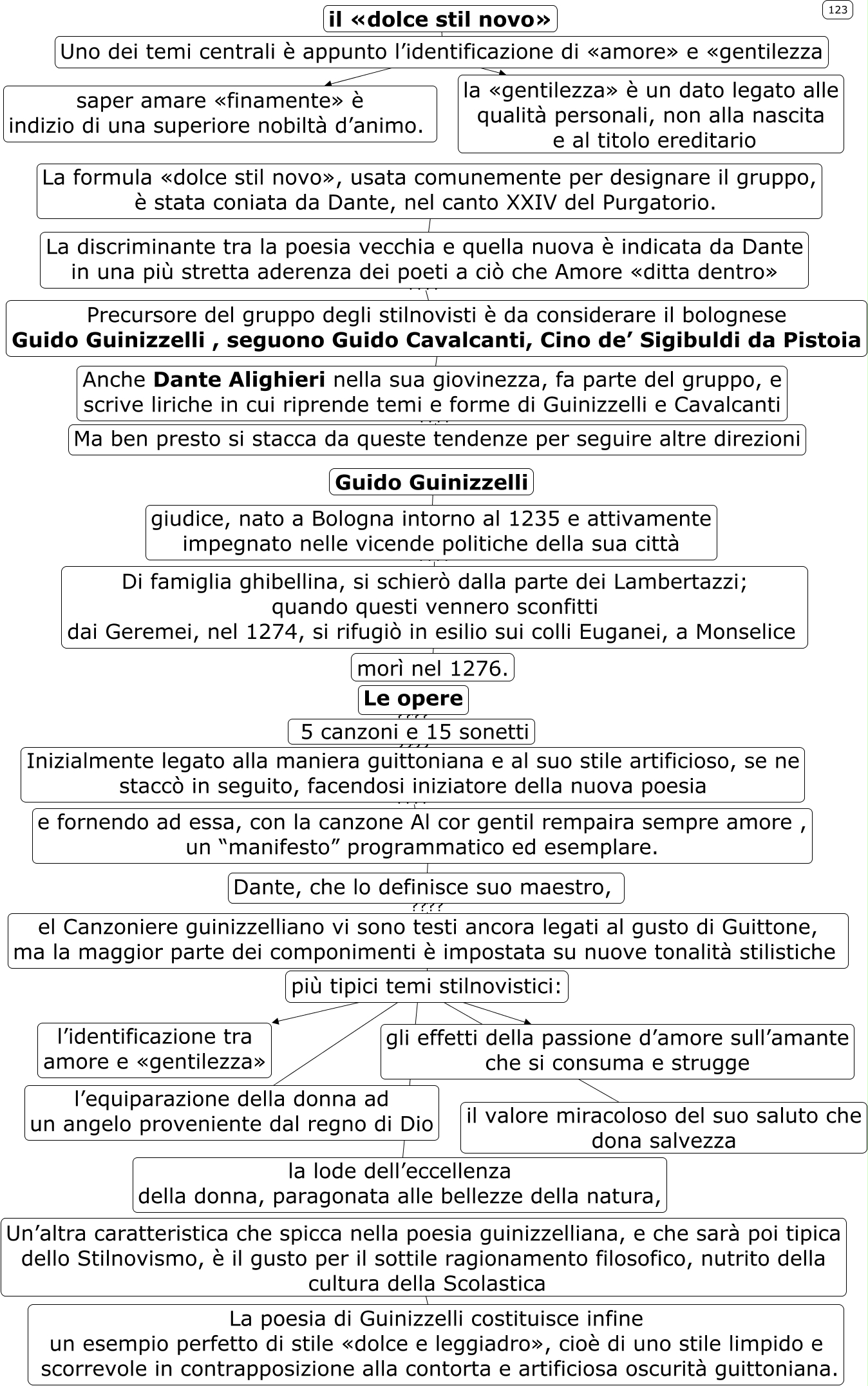 Questa Cmap, creata con IHMC CmapTools, contiene informazioni relative a: 123, il «dolce stil novo» ???? Uno dei temi centrali è appunto l’identificazione di «amore» e «gentilezza, el Canzoniere guinizzelliano vi sono testi ancora legati al gusto di Guittone, ma la maggior parte dei componimenti è impostata su nuove tonalità stilistiche ???? più tipici temi stilnovistici:, Anche Dante Alighieri nella sua giovinezza, fa parte del gruppo, e scrive liriche in cui riprende temi e forme di Guinizzelli e Cavalcanti ???? Ma ben presto si stacca da queste tendenze per seguire altre direzioni, e fornendo ad essa, con la canzone Al cor gentil rempaira sempre amore , un “manifesto�? programmatico ed esemplare. ???? Dante, che lo definisce suo maestro,, Uno dei temi centrali è appunto l’identificazione di «amore» e «gentilezza ???? saper amare «finamente» è indizio di una superiore nobiltà d’animo., più tipici temi stilnovistici: ???? l’equiparazione della donna ad un angelo proveniente dal regno di Dio, Dante, che lo definisce suo maestro, ???? el Canzoniere guinizzelliano vi sono testi ancora legati al gusto di Guittone, ma la maggior parte dei componimenti è impostata su nuove tonalità stilistiche, Inizialmente legato alla maniera guittoniana e al suo stile artificioso, se ne staccò in seguito, facendosi iniziatore della nuova poesia ???? e fornendo ad essa, con la canzone Al cor gentil rempaira sempre amore , un “manifesto�? programmatico ed esemplare., Guido Guinizzelli ???? giudice, nato a Bologna intorno al 1235 e attivamente impegnato nelle vicende politiche della sua città, più tipici temi stilnovistici: ???? il valore miracoloso del suo saluto che dona salvezza, Le opere ???? 5 canzoni e 15 sonetti, Uno dei temi centrali è appunto l’identificazione di «amore» e «gentilezza ???? la «gentilezza» è un dato legato alle qualità personali, non alla nascita e al titolo ereditario, Un’altra caratteristica che spicca nella poesia guinizzelliana, e che sarà poi tipica dello Stilnovismo, è il gusto per il sottile ragionamento filosofico, nutrito della cultura della Scolastica ???? La poesia di Guinizzelli costituisce infine un esempio perfetto di stile «dolce e leggiadro», cioè di uno stile limpido e scorrevole in contrapposizione alla contorta e artificiosa oscurità guittoniana., La discriminante tra la poesia vecchia e quella nuova è indicata da Dante in una più stretta aderenza dei poeti a ciò che Amore «ditta dentro» ???? Precursore del gruppo degli stilnovisti è da considerare il bolognese Guido Guinizzelli , seguono Guido Cavalcanti, Cino de’ Sigibuldi da Pistoia, Di famiglia ghibellina, si schierò dalla parte dei Lambertazzi; quando questi vennero sconfitti dai Geremei, nel 1274, si rifugiò in esilio sui colli Euganei, a Monselice ???? morì nel 1276., giudice, nato a Bologna intorno al 1235 e attivamente impegnato nelle vicende politiche della sua città ???? Di famiglia ghibellina, si schierò dalla parte dei Lambertazzi; quando questi vennero sconfitti dai Geremei, nel 1274, si rifugiò in esilio sui colli Euganei, a Monselice, 5 canzoni e 15 sonetti ???? Inizialmente legato alla maniera guittoniana e al suo stile artificioso, se ne staccò in seguito, facendosi iniziatore della nuova poesia, più tipici temi stilnovistici: ???? la lode dell’eccellenza della donna, paragonata alle bellezze della natura,, Precursore del gruppo degli stilnovisti è da considerare il bolognese Guido Guinizzelli , seguono Guido Cavalcanti, Cino de’ Sigibuldi da Pistoia ???? Anche Dante Alighieri nella sua giovinezza, fa parte del gruppo, e scrive liriche in cui riprende temi e forme di Guinizzelli e Cavalcanti, più tipici temi stilnovistici: ???? l’identificazione tra amore e «gentilezza»