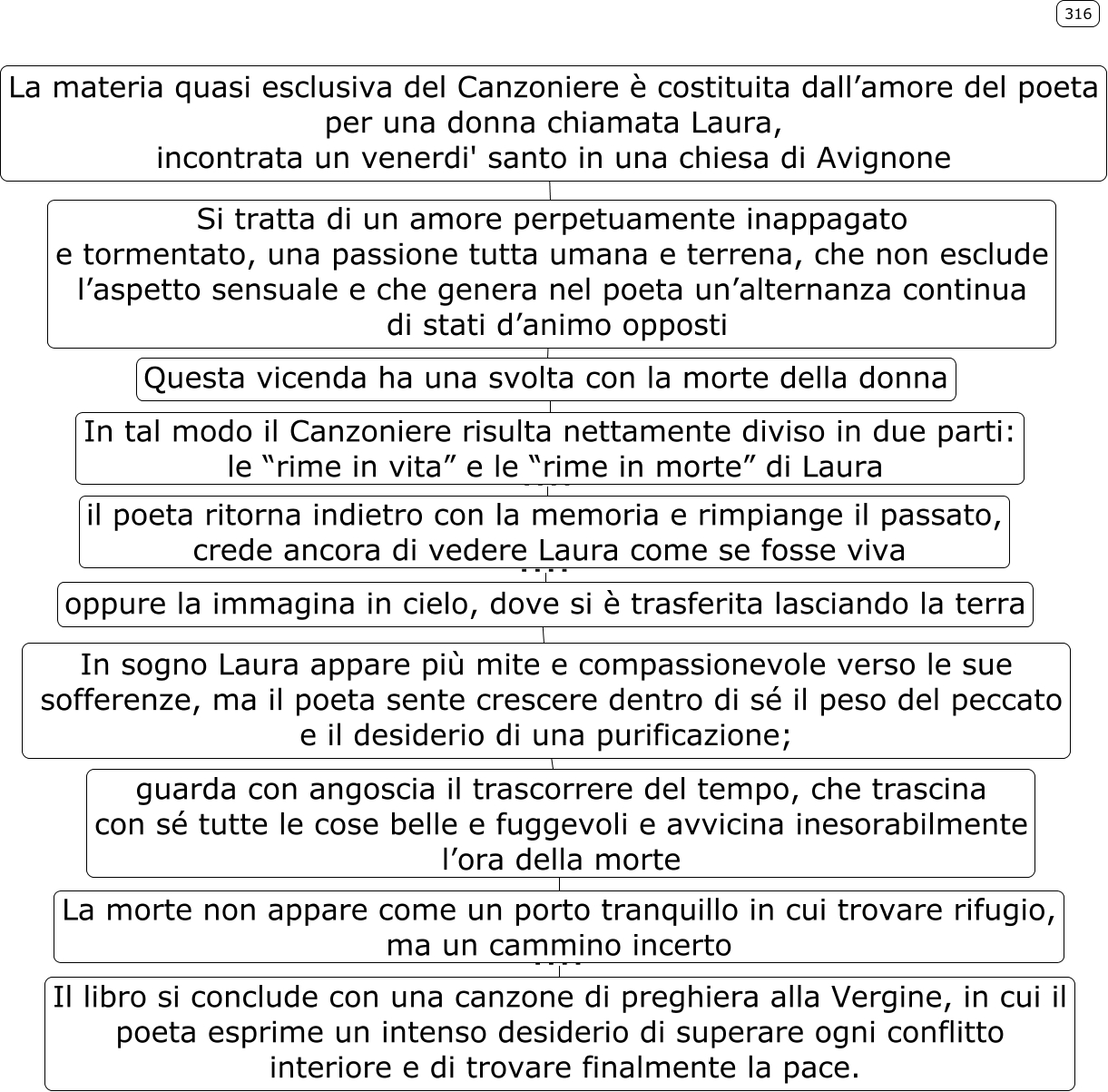 Questa Cmap, creata con IHMC CmapTools, contiene informazioni relative a: 316, La morte non appare come un porto tranquillo in cui trovare rifugio, ma un cammino incerto ???? Il libro si conclude con una canzone di preghiera alla Vergine, in cui il poeta esprime un intenso desiderio di superare ogni conflitto interiore e di trovare finalmente la pace., Si tratta di un amore perpetuamente inappagato e tormentato, una passione tutta umana e terrena, che non esclude l’aspetto sensuale e che genera nel poeta un’alternanza continua di stati d’animo opposti ???? Questa vicenda ha una svolta con la morte della donna, guarda con angoscia il trascorrere del tempo, che trascina con sé tutte le cose belle e fuggevoli e avvicina inesorabilmente l’ora della morte ???? La morte non appare come un porto tranquillo in cui trovare rifugio, ma un cammino incerto, il poeta ritorna indietro con la memoria e rimpiange il passato, crede ancora di vedere Laura come se fosse viva ???? oppure la immagina in cielo, dove si è trasferita lasciando la terra, oppure la immagina in cielo, dove si è trasferita lasciando la terra ???? In sogno Laura appare più mite e compassionevole verso le sue sofferenze, ma il poeta sente crescere dentro di sé il peso del peccato e il desiderio di una purificazione;, La materia quasi esclusiva del Canzoniere è costituita dall’amore del poeta per una donna chiamata Laura, incontrata un venerdi' santo in una chiesa di Avignone ???? Si tratta di un amore perpetuamente inappagato e tormentato, una passione tutta umana e terrena, che non esclude l’aspetto sensuale e che genera nel poeta un’alternanza continua di stati d’animo opposti, Questa vicenda ha una svolta con la morte della donna ???? In tal modo il Canzoniere risulta nettamente diviso in due parti: le “rime in vita�? e le “rime in morte�? di Laura, In sogno Laura appare più mite e compassionevole verso le sue sofferenze, ma il poeta sente crescere dentro di sé il peso del peccato e il desiderio di una purificazione; ???? guarda con angoscia il trascorrere del tempo, che trascina con sé tutte le cose belle e fuggevoli e avvicina inesorabilmente l’ora della morte, In tal modo il Canzoniere risulta nettamente diviso in due parti: le “rime in vita�? e le “rime in morte�? di Laura ???? il poeta ritorna indietro con la memoria e rimpiange il passato, crede ancora di vedere Laura come se fosse viva