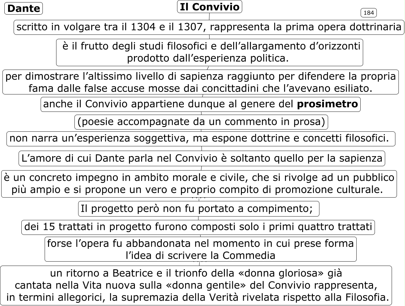 Questa Cmap, creata con IHMC CmapTools, contiene informazioni relative a: 184, Il Convivio ???? scritto in volgare tra il 1304 e il 1307, rappresenta la prima opera dottrinaria, non narra un’esperienza soggettiva, ma espone dottrine e concetti filosofici. ???? L’amore di cui Dante parla nel Convivio è soltanto quello per la sapienza, scritto in volgare tra il 1304 e il 1307, rappresenta la prima opera dottrinaria ???? è il frutto degli studi filosofici e dell’allargamento d’orizzonti prodotto dall’esperienza politica., Il progetto però non fu portato a compimento; ???? dei 15 trattati in progetto furono composti solo i primi quattro trattati, per dimostrare l’altissimo livello di sapienza raggiunto per difendere la propria fama dalle false accuse mosse dai concittadini che l’avevano esiliato. ???? anche il Convivio appartiene dunque al genere del prosimetro, anche il Convivio appartiene dunque al genere del prosimetro ???? (poesie accompagnate da un commento in prosa), è un concreto impegno in ambito morale e civile, che si rivolge ad un pubblico più ampio e si propone un vero e proprio compito di promozione culturale. ???? Il progetto però non fu portato a compimento;, forse l’opera fu abbandonata nel momento in cui prese forma l’idea di scrivere la Commedia ???? un ritorno a Beatrice e il trionfo della «donna gloriosa» già cantata nella Vita nuova sulla «donna gentile» del Convivio rappresenta, in termini allegorici, la supremazia della Verità rivelata rispetto alla Filosofia., dei 15 trattati in progetto furono composti solo i primi quattro trattati ???? forse l’opera fu abbandonata nel momento in cui prese forma l’idea di scrivere la Commedia, L’amore di cui Dante parla nel Convivio è soltanto quello per la sapienza ???? è un concreto impegno in ambito morale e civile, che si rivolge ad un pubblico più ampio e si propone un vero e proprio compito di promozione culturale., è il frutto degli studi filosofici e dell’allargamento d’orizzonti prodotto dall’esperienza politica. ???? per dimostrare l’altissimo livello di sapienza raggiunto per difendere la propria fama dalle false accuse mosse dai concittadini che l’avevano esiliato., (poesie accompagnate da un commento in prosa) ???? non narra un’esperienza soggettiva, ma espone dottrine e concetti filosofici.