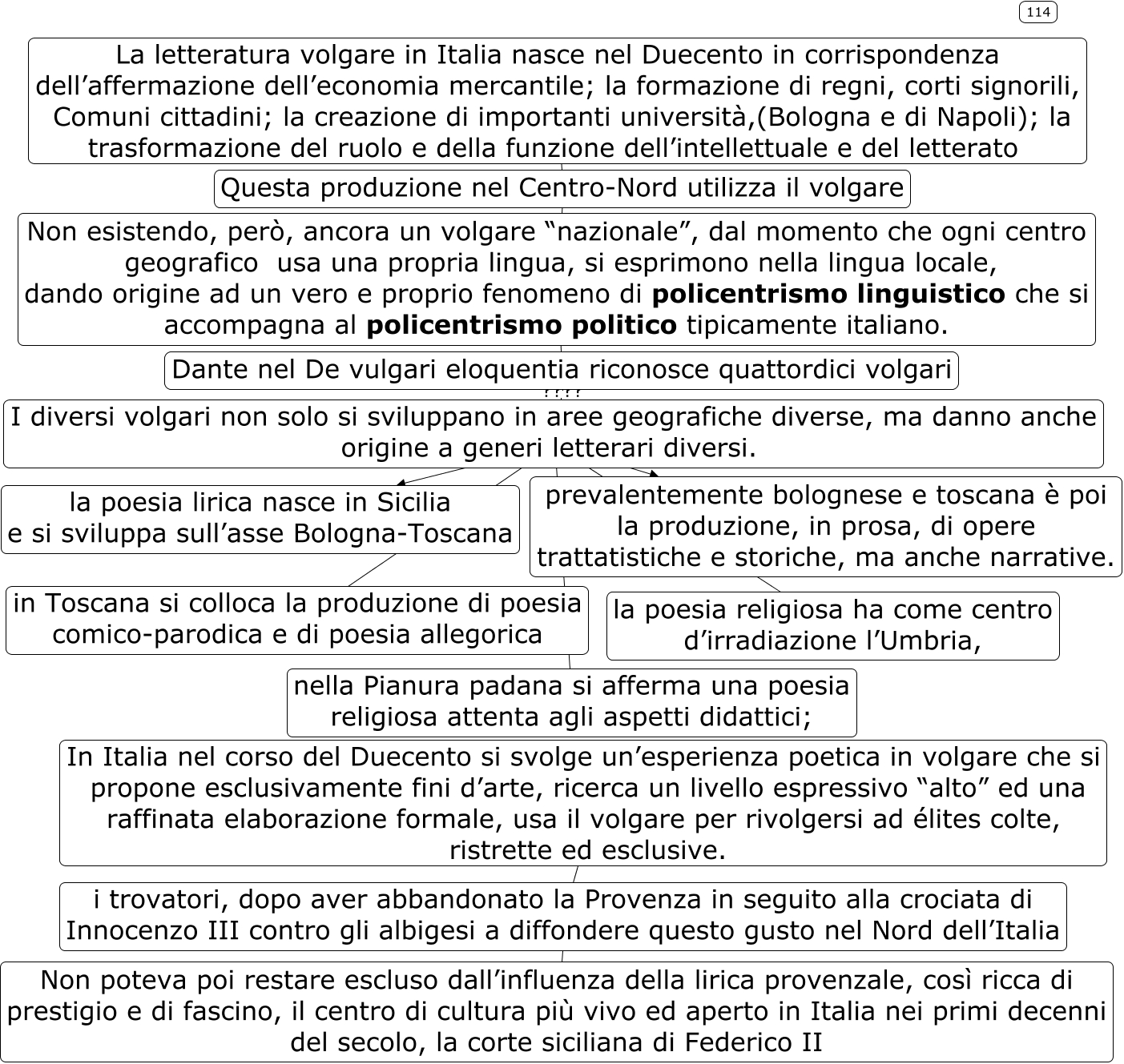Questa Cmap, creata con IHMC CmapTools, contiene informazioni relative a: 96, Dante nel De vulgari eloquentia riconosce quattordici volgari ???? I diversi volgari non solo si sviluppano in aree geografiche diverse, ma danno anche origine a generi letterari diversi., Questa produzione nel Centro-Nord utilizza il volgare ???? Non esistendo, però, ancora un volgare “nazionale�?, dal momento che ogni centro geografico usa una propria lingua, si esprimono nella lingua locale, dando origine ad un vero e proprio fenomeno di policentrismo linguistico che si accompagna al policentrismo politico tipicamente italiano., In Italia nel corso del Duecento si svolge un’esperienza poetica in volgare che si propone esclusivamente fini d’arte, ricerca un livello espressivo “alto�? ed una raffinata elaborazione formale, usa il volgare per rivolgersi ad élites colte, ristrette ed esclusive. ???? i trovatori, dopo aver abbandonato la Provenza in seguito alla crociata di Innocenzo III contro gli albigesi a diffondere questo gusto nel Nord dell’Italia, La letteratura volgare in Italia nasce nel Duecento in corrispondenza dell’affermazione dell’economia mercantile; la formazione di regni, corti signorili, Comuni cittadini; la creazione di importanti università,(Bologna e di Napoli); la trasformazione del ruolo e della funzione dell’intellettuale e del letterato ???? Questa produzione nel Centro-Nord utilizza il volgare, I diversi volgari non solo si sviluppano in aree geografiche diverse, ma danno anche origine a generi letterari diversi. ???? prevalentemente bolognese e toscana è poi la produzione, in prosa, di opere trattatistiche e storiche, ma anche narrative., I diversi volgari non solo si sviluppano in aree geografiche diverse, ma danno anche origine a generi letterari diversi. ???? la poesia lirica nasce in Sicilia e si sviluppa sull’asse Bologna-Toscana, Non esistendo, però, ancora un volgare “nazionale�?, dal momento che ogni centro geografico usa una propria lingua, si esprimono nella lingua locale, dando origine ad un vero e proprio fenomeno di policentrismo linguistico che si accompagna al policentrismo politico tipicamente italiano. ???? Dante nel De vulgari eloquentia riconosce quattordici volgari, I diversi volgari non solo si sviluppano in aree geografiche diverse, ma danno anche origine a generi letterari diversi. ???? la poesia religiosa ha come centro d’irradiazione l’Umbria,, i trovatori, dopo aver abbandonato la Provenza in seguito alla crociata di Innocenzo III contro gli albigesi a diffondere questo gusto nel Nord dell’Italia ???? Non poteva poi restare escluso dall’influenza della lirica provenzale, così ricca di prestigio e di fascino, il centro di cultura più vivo ed aperto in Italia nei primi decenni del secolo, la corte siciliana di Federico II, I diversi volgari non solo si sviluppano in aree geografiche diverse, ma danno anche origine a generi letterari diversi. ???? in Toscana si colloca la produzione di poesia comico-parodica e di poesia allegorica, I diversi volgari non solo si sviluppano in aree geografiche diverse, ma danno anche origine a generi letterari diversi. ???? nella Pianura padana si afferma una poesia religiosa attenta agli aspetti didattici;