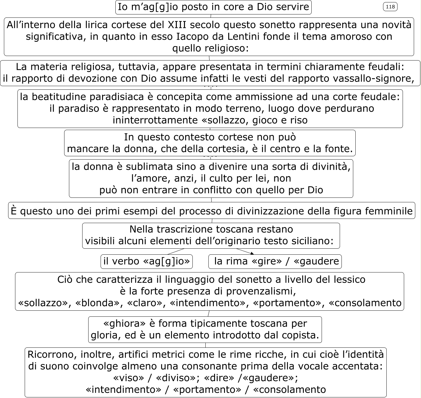 Questa Cmap, creata con IHMC CmapTools, contiene informazioni relative a: 118, In questo contesto cortese non può mancare la donna, che della cortesia, è il centro e la fonte. ???? la donna è sublimata sino a divenire una sorta di divinità, l’amore, anzi, il culto per lei, non può non entrare in conflitto con quello per Dio, la donna è sublimata sino a divenire una sorta di divinità, l’amore, anzi, il culto per lei, non può non entrare in conflitto con quello per Dio ???? È questo uno dei primi esempi del processo di divinizzazione della figura femminile, Nella trascrizione toscana restano visibili alcuni elementi dell’originario testo siciliano: ???? il verbo «ag[g]io», «ghiora» è forma tipicamente toscana per gloria, ed è un elemento introdotto dal copista. ???? Ricorrono, inoltre, artifici metrici come le rime ricche, in cui cioè l’identità di suono coinvolge almeno una consonante prima della vocale accentata: «viso» / «diviso»; «dire» /«gaudere»; «intendimento» / «portamento» / «consolamento, la beatitudine paradisiaca è concepita come ammissione ad una corte feudale: il paradiso è rappresentato in modo terreno, luogo dove perdurano ininterrottamente «sollazzo, gioco e riso ???? In questo contesto cortese non può mancare la donna, che della cortesia, è il centro e la fonte., La materia religiosa, tuttavia, appare presentata in termini chiaramente feudali: il rapporto di devozione con Dio assume infatti le vesti del rapporto vassallo-signore, ???? la beatitudine paradisiaca è concepita come ammissione ad una corte feudale: il paradiso è rappresentato in modo terreno, luogo dove perdurano ininterrottamente «sollazzo, gioco e riso, È questo uno dei primi esempi del processo di divinizzazione della figura femminile ???? Nella trascrizione toscana restano visibili alcuni elementi dell’originario testo siciliano:, All’interno della lirica cortese del XIII secolo questo sonetto rappresenta una novità significativa, in quanto in esso Iacopo da Lentini fonde il tema amoroso con quello religioso: ???? La materia religiosa, tuttavia, appare presentata in termini chiaramente feudali: il rapporto di devozione con Dio assume infatti le vesti del rapporto vassallo-signore,, Ciò che caratterizza il linguaggio del sonetto a livello del lessico è la forte presenza di provenzalismi, «sollazzo», «blonda», «claro», «intendimento», «portamento», «consolamento ???? «ghiora» è forma tipicamente toscana per gloria, ed è un elemento introdotto dal copista., Nella trascrizione toscana restano visibili alcuni elementi dell’originario testo siciliano: ???? la rima «gire» / «gaudere, Io m’ag[g]io posto in core a Dio servire ???? All’interno della lirica cortese del XIII secolo questo sonetto rappresenta una novità significativa, in quanto in esso Iacopo da Lentini fonde il tema amoroso con quello religioso: