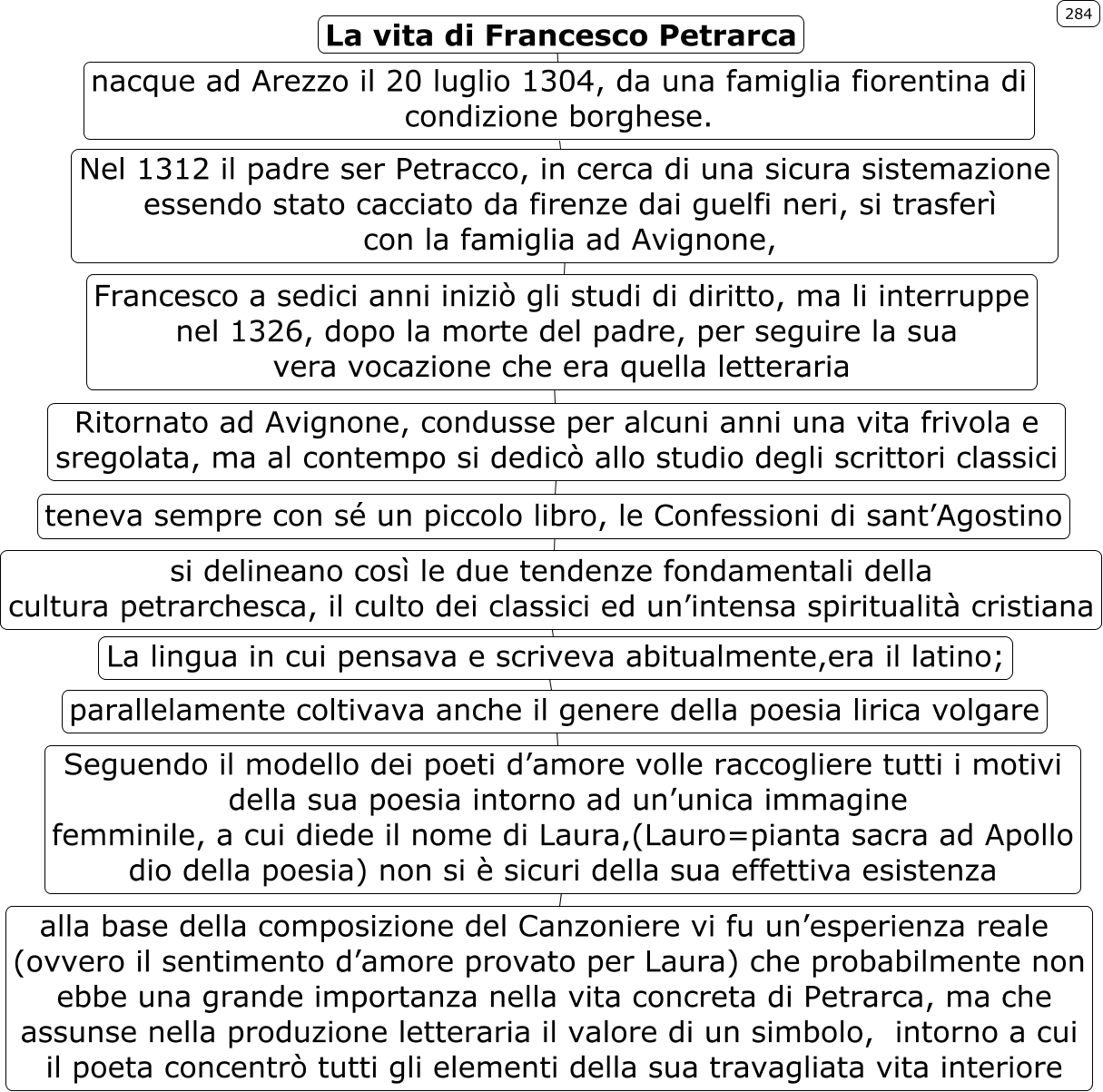 Questa Cmap, creata con IHMC CmapTools, contiene informazioni relative a: 284, si delineano così le due tendenze fondamentali della cultura petrarchesca, il culto dei classici ed un’intensa spiritualità cristiana ???? La lingua in cui pensava e scriveva abitualmente,era il latino;, La vita di Francesco Petrarca ???? nacque ad Arezzo il 20 luglio 1304, da una famiglia fiorentina di condizione borghese., nacque ad Arezzo il 20 luglio 1304, da una famiglia fiorentina di condizione borghese. ???? Nel 1312 il padre ser Petracco, in cerca di una sicura sistemazione essendo stato cacciato da firenze dai guelfi neri, si trasferì con la famiglia ad Avignone,, Seguendo il modello dei poeti d’amore volle raccogliere tutti i motivi della sua poesia intorno ad un’unica immagine femminile, a cui diede il nome di Laura,(Lauro=pianta sacra ad Apollo dio della poesia) non si è sicuri della sua effettiva esistenza ???? alla base della composizione del Canzoniere vi fu un’esperienza reale (ovvero il sentimento d’amore provato per Laura) che probabilmente non ebbe una grande importanza nella vita concreta di Petrarca, ma che assunse nella produzione letteraria il valore di un simbolo, intorno a cui il poeta concentrò tutti gli elementi della sua travagliata vita interiore, Francesco a sedici anni iniziò gli studi di diritto, ma li interruppe nel 1326, dopo la morte del padre, per seguire la sua vera vocazione che era quella letteraria ???? Ritornato ad Avignone, condusse per alcuni anni una vita frivola e sregolata, ma al contempo si dedicò allo studio degli scrittori classici, teneva sempre con sé un piccolo libro, le Confessioni di sant’Agostino ???? si delineano così le due tendenze fondamentali della cultura petrarchesca, il culto dei classici ed un’intensa spiritualità cristiana, Nel 1312 il padre ser Petracco, in cerca di una sicura sistemazione essendo stato cacciato da firenze dai guelfi neri, si trasferì con la famiglia ad Avignone, ???? Francesco a sedici anni iniziò gli studi di diritto, ma li interruppe nel 1326, dopo la morte del padre, per seguire la sua vera vocazione che era quella letteraria, Ritornato ad Avignone, condusse per alcuni anni una vita frivola e sregolata, ma al contempo si dedicò allo studio degli scrittori classici ???? teneva sempre con sé un piccolo libro, le Confessioni di sant’Agostino, La lingua in cui pensava e scriveva abitualmente,era il latino; ???? parallelamente coltivava anche il genere della poesia lirica volgare, parallelamente coltivava anche il genere della poesia lirica volgare ???? Seguendo il modello dei poeti d’amore volle raccogliere tutti i motivi della sua poesia intorno ad un’unica immagine femminile, a cui diede il nome di Laura,(Lauro=pianta sacra ad Apollo dio della poesia) non si è sicuri della sua effettiva esistenza