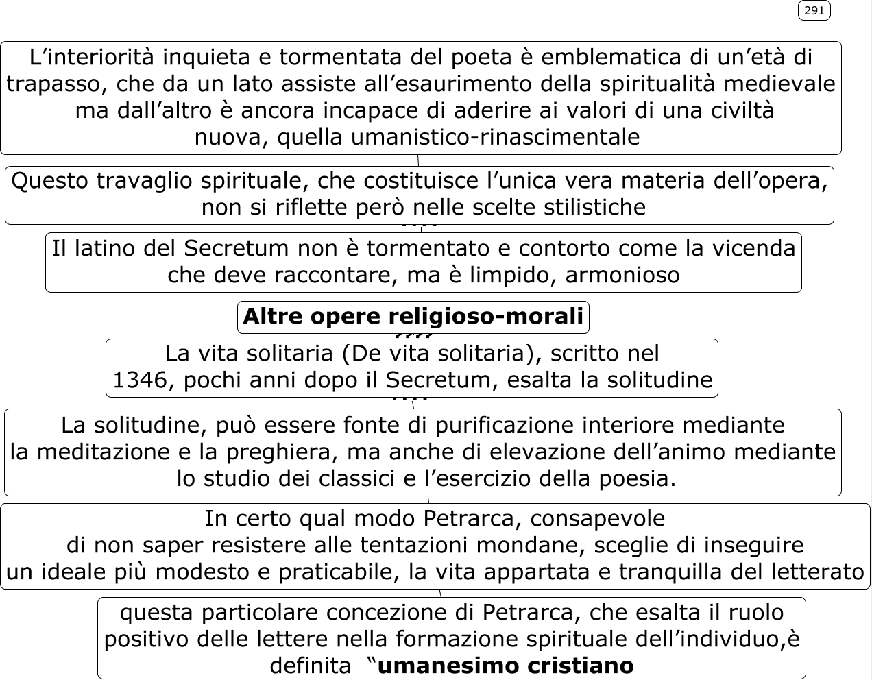Questa Cmap, creata con IHMC CmapTools, contiene informazioni relative a: 292, L’interiorità inquieta e tormentata del poeta è emblematica di un’età di trapasso, che da un lato assiste all’esaurimento della spiritualità medievale ma dall’altro è ancora incapace di aderire ai valori di una civiltà nuova, quella umanistico-rinascimentale ???? Questo travaglio spirituale, che costituisce l’unica vera materia dell’opera, non si riflette però nelle scelte stilistiche, La solitudine, può essere fonte di purificazione interiore mediante la meditazione e la preghiera, ma anche di elevazione dell’animo mediante lo studio dei classici e l’esercizio della poesia. ???? In certo qual modo Petrarca, consapevole di non saper resistere alle tentazioni mondane, sceglie di inseguire un ideale più modesto e praticabile, la vita appartata e tranquilla del letterato, In certo qual modo Petrarca, consapevole di non saper resistere alle tentazioni mondane, sceglie di inseguire un ideale più modesto e praticabile, la vita appartata e tranquilla del letterato ???? questa particolare concezione di Petrarca, che esalta il ruolo positivo delle lettere nella formazione spirituale dell’individuo,è definita “umanesimo cristiano, La vita solitaria (De vita solitaria), scritto nel 1346, pochi anni dopo il Secretum, esalta la solitudine ???? La solitudine, può essere fonte di purificazione interiore mediante la meditazione e la preghiera, ma anche di elevazione dell’animo mediante lo studio dei classici e l’esercizio della poesia., Questo travaglio spirituale, che costituisce l’unica vera materia dell’opera, non si riflette però nelle scelte stilistiche ???? Il latino del Secretum non è tormentato e contorto come la vicenda che deve raccontare, ma è limpido, armonioso, Altre opere religioso-morali ???? La vita solitaria (De vita solitaria), scritto nel 1346, pochi anni dopo il Secretum, esalta la solitudine