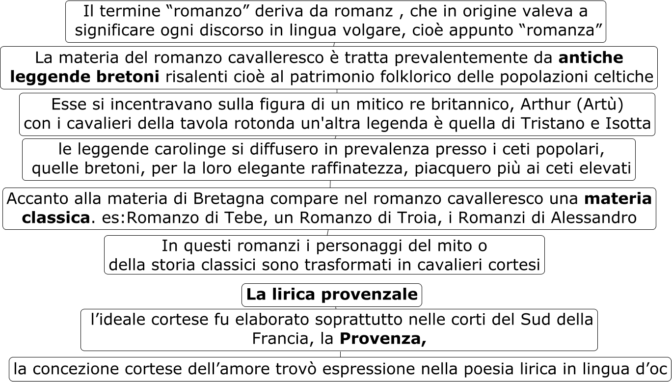 Questa Cmap, creata con IHMC CmapTools, contiene informazioni relative a: 53, le leggende carolinge si diffusero in prevalenza presso i ceti popolari, quelle bretoni, per la loro elegante raffinatezza, piacquero più ai ceti elevati ???? Accanto alla materia di Bretagna compare nel romanzo cavalleresco una materia classica. es:Romanzo di Tebe, un Romanzo di Troia, i Romanzi di Alessandro, Accanto alla materia di Bretagna compare nel romanzo cavalleresco una materia classica. es:Romanzo di Tebe, un Romanzo di Troia, i Romanzi di Alessandro ???? In questi romanzi i personaggi del mito o della storia classici sono trasformati in cavalieri cortesi, l’ideale cortese fu elaborato soprattutto nelle corti del Sud della Francia, la Provenza, ???? la concezione cortese dell’amore trovò espressione nella poesia lirica in lingua d’oc, La lirica provenzale ???? l’ideale cortese fu elaborato soprattutto nelle corti del Sud della Francia, la Provenza,, Il termine “romanzo�? deriva da romanz , che in origine valeva a significare ogni discorso in lingua volgare, cioè appunto “romanza�? ???? La materia del romanzo cavalleresco è tratta prevalentemente da antiche leggende bretoni risalenti cioè al patrimonio folklorico delle popolazioni celtiche, La materia del romanzo cavalleresco è tratta prevalentemente da antiche leggende bretoni risalenti cioè al patrimonio folklorico delle popolazioni celtiche ???? Esse si incentravano sulla figura di un mitico re britannico, Arthur (Artù) con i cavalieri della tavola rotonda un'altra legenda è quella di Tristano e Isotta, Esse si incentravano sulla figura di un mitico re britannico, Arthur (Artù) con i cavalieri della tavola rotonda un'altra legenda è quella di Tristano e Isotta ???? le leggende carolinge si diffusero in prevalenza presso i ceti popolari, quelle bretoni, per la loro elegante raffinatezza, piacquero più ai ceti elevati