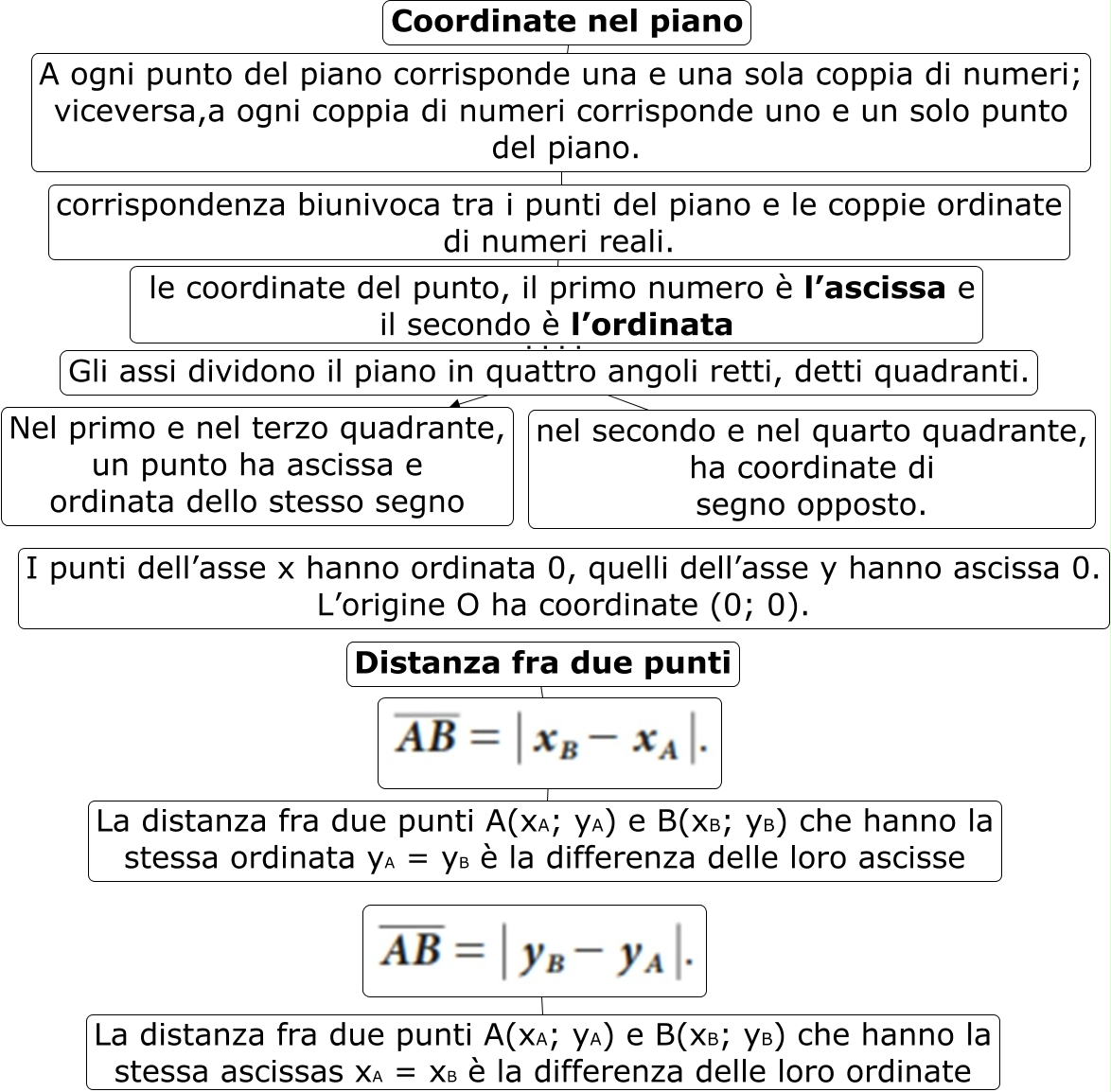 Questa Cmap, creata con IHMC CmapTools, contiene informazioni relative a: assi cartesiane 129, A ogni punto del piano corrisponde una e una sola coppia di numeri; viceversa,a ogni coppia di numeri corrisponde uno e un solo punto del piano. ???? corrispondenza biunivoca tra i punti del piano e le coppie ordinate di numeri reali., le coordinate del punto, il primo numero è l’ascissa e il secondo è l’ordinata ???? Gli assi dividono il piano in quattro angoli retti, detti quadranti., ???? La distanza fra due punti A(xA; yA) e B(xB; yB) che hanno la stessa ascissas xA = xB è la differenza delle loro ordinate, Coordinate nel piano ???? A ogni punto del piano corrisponde una e una sola coppia di numeri; viceversa,a ogni coppia di numeri corrisponde uno e un solo punto del piano., Gli assi dividono il piano in quattro angoli retti, detti quadranti. ???? nel secondo e nel quarto quadrante, ha coordinate di segno opposto., ???? La distanza fra due punti A(xA; yA) e B(xB; yB) che hanno la stessa ordinata yA = yB è la differenza delle loro ascisse, corrispondenza biunivoca tra i punti del piano e le coppie ordinate di numeri reali. ???? le coordinate del punto, il primo numero è l’ascissa e il secondo è l’ordinata, Gli assi dividono il piano in quattro angoli retti, detti quadranti. ???? Nel primo e nel terzo quadrante, un punto ha ascissa e ordinata dello stesso segno, Distanza fra due punti ????