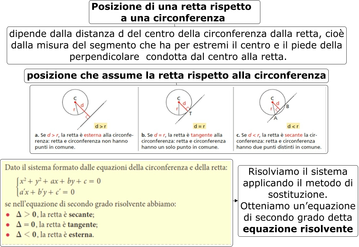 Questa Cmap, creata con IHMC CmapTools, contiene informazioni relative a: circonferenza 248, Posizione di una retta rispetto a una circonferenza ???? dipende dalla distanza d del centro della circonferenza dalla retta, cioè dalla misura del segmento che ha per estremi il centro e il piede della perpendicolare condotta dal centro alla retta., posizione che assume la retta rispetto alla circonferenza ????, ???? Risolviamo il sistema applicando il metodo di sostituzione. Otteniamo un’equazione di secondo grado detta equazione risolvente