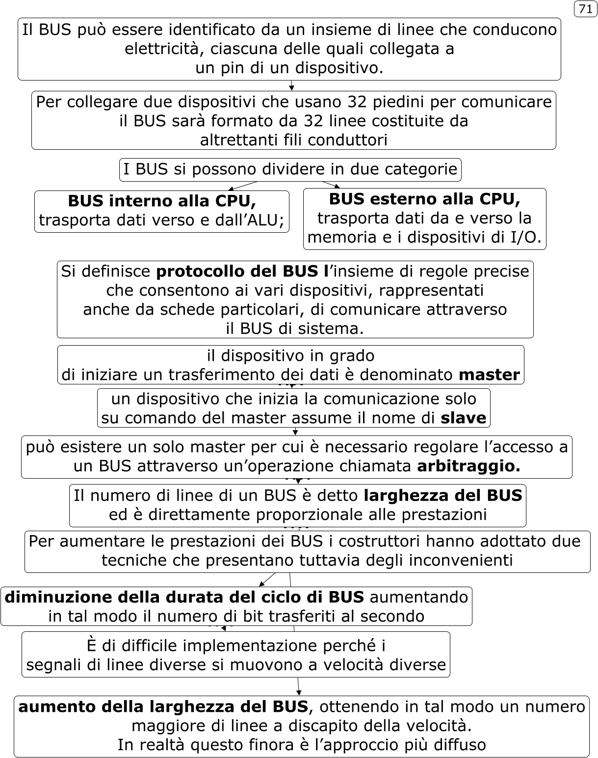 Questa Cmap, creata con IHMC CmapTools, contiene informazioni relative a: 73, Per aumentare le prestazioni dei BUS i costruttori hanno adottato due tecniche che presentano tuttavia degli inconvenienti ???? aumento della larghezza del BUS, ottenendo in tal modo un numero maggiore di linee a discapito della velocità. In realtà questo finora è l’approccio più diffuso, Il numero di linee di un BUS è detto larghezza del BUS ed è direttamente proporzionale alle prestazioni ???? Per aumentare le prestazioni dei BUS i costruttori hanno adottato due tecniche che presentano tuttavia degli inconvenienti, Per aumentare le prestazioni dei BUS i costruttori hanno adottato due tecniche che presentano tuttavia degli inconvenienti ???? diminuzione della durata del ciclo di BUS aumentando in tal modo il numero di bit trasferiti al secondo, può esistere un solo master per cui è necessario regolare l’accesso a un BUS attraverso un’operazione chiamata arbitraggio. ???? Il numero di linee di un BUS è detto larghezza del BUS ed è direttamente proporzionale alle prestazioni, I BUS si possono dividere in due categorie ???? BUS interno alla CPU, trasporta dati verso e dall’ALU;, il dispositivo in grado di iniziare un trasferimento dei dati è denominato master ???? un dispositivo che inizia la comunicazione solo su comando del master assume il nome di slave, Il BUS può essere identificato da un insieme di linee che conducono elettricità, ciascuna delle quali collegata a un pin di un dispositivo. ???? Per collegare due dispositivi che usano 32 piedini per comunicare il BUS sarà formato da 32 linee costituite da altrettanti fili conduttori, I BUS si possono dividere in due categorie ???? BUS esterno alla CPU, trasporta dati da e verso la memoria e i dispositivi di I/O., un dispositivo che inizia la comunicazione solo su comando del master assume il nome di slave ???? può esistere un solo master per cui è necessario regolare l’accesso a un BUS attraverso un’operazione chiamata arbitraggio., diminuzione della durata del ciclo di BUS aumentando in tal modo il numero di bit trasferiti al secondo ???? È di difficile implementazione perché i segnali di linee diverse si muovono a velocità diverse