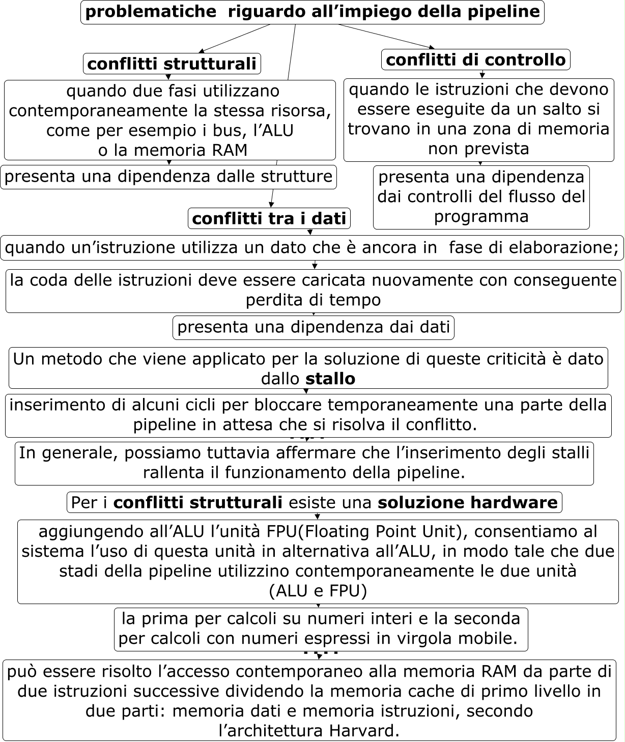 Questa Cmap, creata con IHMC CmapTools, contiene informazioni relative a: inputoutput 71, conflitti tra i dati ???? quando un’istruzione utilizza un dato che è ancora in fase di elaborazione;, la prima per calcoli su numeri interi e la seconda per calcoli con numeri espressi in virgola mobile. ???? può essere risolto l’accesso contemporaneo alla memoria RAM da parte di due istruzioni successive dividendo la memoria cache di primo livello in due parti: memoria dati e memoria istruzioni, secondo l’architettura Harvard., quando le istruzioni che devono essere eseguite da un salto si trovano in una zona di memoria non prevista ???? presenta una dipendenza dai controlli del flusso del programma, aggiungendo all’ALU l’unità FPU(Floating Point Unit), consentiamo al sistema l’uso di questa unità in alternativa all’ALU, in modo tale che due stadi della pipeline utilizzino contemporaneamente le due unità (ALU e FPU) ???? la prima per calcoli su numeri interi e la seconda per calcoli con numeri espressi in virgola mobile., problematiche riguardo all’impiego della pipeline ???? conflitti tra i dati, conflitti strutturali ???? quando due fasi utilizzano contemporaneamente la stessa risorsa, come per esempio i bus, l’ALU o la memoria RAM, Per i conflitti strutturali esiste una soluzione hardware ???? aggiungendo all’ALU l’unità FPU(Floating Point Unit), consentiamo al sistema l’uso di questa unità in alternativa all’ALU, in modo tale che due stadi della pipeline utilizzino contemporaneamente le due unità (ALU e FPU), problematiche riguardo all’impiego della pipeline ???? conflitti di controllo, quando un’istruzione utilizza un dato che è ancora in fase di elaborazione; ???? la coda delle istruzioni deve essere caricata nuovamente con conseguente perdita di tempo, inserimento di alcuni cicli per bloccare temporaneamente una parte della pipeline in attesa che si risolva il conflitto. ???? In generale, possiamo tuttavia affermare che l’inserimento degli stalli rallenta il funzionamento della pipeline., problematiche riguardo all’impiego della pipeline ???? conflitti strutturali, conflitti di controllo ???? quando le istruzioni che devono essere eseguite da un salto si trovano in una zona di memoria non prevista, la coda delle istruzioni deve essere caricata nuovamente con conseguente perdita di tempo ???? presenta una dipendenza dai dati, Un metodo che viene applicato per la soluzione di queste criticità è dato dallo stallo ???? inserimento di alcuni cicli per bloccare temporaneamente una parte della pipeline in attesa che si risolva il conflitto., quando due fasi utilizzano contemporaneamente la stessa risorsa, come per esempio i bus, l’ALU o la memoria RAM ???? presenta una dipendenza dalle strutture