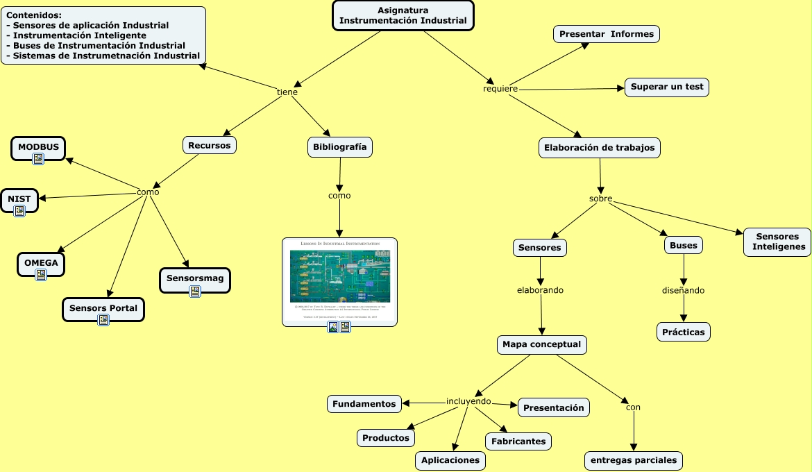 Este Cmap, tiene información relacionada con: 0.a. Asignatura, Recursos como MODBUS, Bibliografía como, Buses diseñando Prácticas, Elaboración de trabajos sobre Buses, Mapa conceptual incluyendo Aplicaciones, Recursos como Sensors Portal, Mapa conceptual incluyendo Fundamentos, Asignatura Instrumentación Industrial tiene Bibliografía, Elaboración de trabajos sobre Sensores Inteligenes, Asignatura Instrumentación Industrial requiere Presentar Informes, Elaboración de trabajos sobre Sensores, Sensores elaborando Mapa conceptual, Asignatura Instrumentación Industrial requiere Superar un test, Asignatura Instrumentación Industrial requiere Elaboración de trabajos, Recursos como OMEGA, Recursos como Sensorsmag, Asignatura Instrumentación Industrial tiene Contenidos: - Sensores de aplicación Industrial - Instrumentación Inteligente - Buses de Instrumentación Industrial - Sistemas de Instrumetnación Industrial, Recursos como NIST, Asignatura Instrumentación Industrial tiene Recursos, Mapa conceptual incluyendo Presentación
