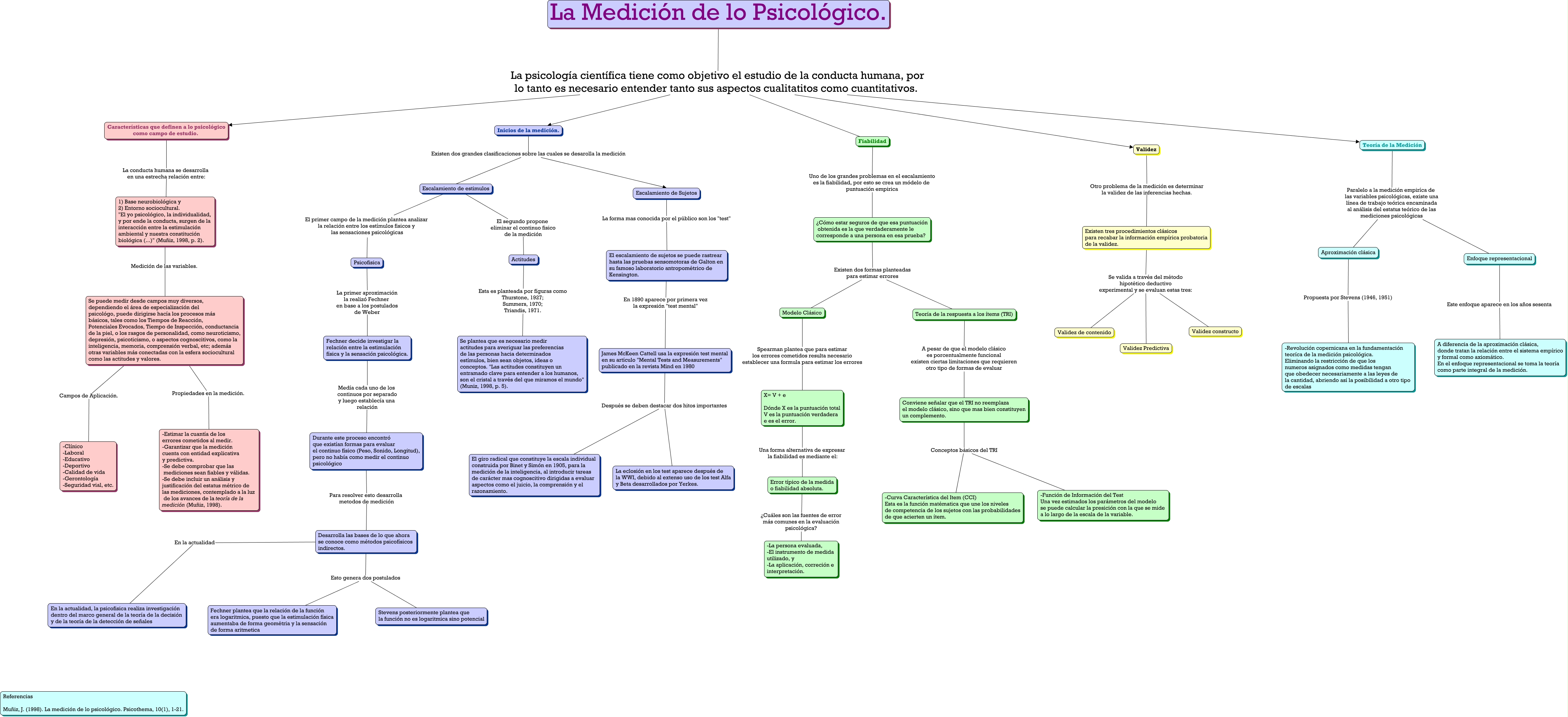 Este Cmap, tiene información relacionada con: Psicometría, Durante este proceso encontró que existían formas para evaluar el continuo físico (Peso, Sonido, Longitud), pero no había como medir el continuo psicológico Para resolver esto desarrolla metodos de medición Desarrolla las bases de lo que ahora se conoce como métodos psicofísicos indirectos., Escalamiento de estimulos El segundo propone eliminar el continuo fisico de la medición Actitudes, Psicofisica La primer aproximación la realizó Fechner en base a los postulados de Weber Fechner decide investigar la relación entre la estimulación física y la sensación psicológica., La Medición de lo Psicológico. La psicología científica tiene como objetivo el estudio de la conducta humana, por lo tanto es necesario entender tanto sus aspectos cualitatitos como cuantitativos. Validez, Enfoque representacional Este enfoque aparece en los años sesenta A diferencia de la aproximación clásica, donde tratan la relación entre el sistema empírico y formal como axiomático. En el enfoque representacional se toma la teoría como parte integral de la medición., James McKeen Cattell usa la expresión test mental en su artículo "Mental Tests and Measurements" publicado en la revista Mind en 1980 Después se deben destacar dos hitos importantes La eclosión en los test aparece después de la WWI, debido al extenso uso de los test Alfa y Beta desarrollados por Yerkes., Existen tres procedimientos clásicos para recabar la información empírica probatoria de la validez. Se valida a través del método hipotético deductivo experimental y se evaluan estas tres: Validez Predictiva, Escalamiento de Sujetos La forma mas conocida por el público son los "test" El escalamiento de sujetos se puede rastrear hasta las pruebas sensomotoras de Galton en su famoso laboratorio antropométrico de Kensington., Escalamiento de estimulos El primer campo de la medición plantea analizar la relación entre los estímulos fisicos y las sensaciones psicológicas Psicofisica, Modelo Clásico Spearman plantea que para estimar los errores cometidos resulta necesario establecer una formula para estimar los errores X= V + e Dónde X es la puntuación total V es la puntuación verdadera e es el error., Desarrolla las bases de lo que ahora se conoce como métodos psicofísicos indirectos. Esto genera dos postulados Fechner plantea que la relación de la función era logaritmica, puesto que la estimulación física aumentaba de forma geométria y la sensación de forma aritmetica, Error típico de la medida o fiabilidad absoluta. ¿Cuáles son las fuentes de error más comunes en la evaluación psicológica? -La persona evaluada, -El instrumento de medida utilizado, y -La aplicación, correción e interpretación., Inicios de la medición. Existen dos grandes clasificaciones sobre las cuales se desarolla la medición Escalamiento de estimulos, Aproximación clásica Propuesta por Stevens (1946, 1951) -Revolución copernicana en la fundamentación teoríca de la medición psicológica. Eliminando la restricción de que los numeros asignados como medidas tengan que obedecer necesariamente a las leyes de la cantidad, abriendo así la posibilidad a otro tipo de escalas, Actitudes Esta es planteada por fíguras como Thurstone, 1927; Summers, 1970; Triandis, 1971. Se plantea que es necesario medir actitudes para averiguar las preferencias de las personas hacia determinados estímulos, bien sean objetos, ideas o conceptos. "Las actitudes constituyen un entramado clave para entender a los humanos, son el cristal a través del que miramos el mundo" (Muniz, 1998, p. 5)., Teoría de la Medición Paralelo a la medición empiríca de las variables psicológicas, existe una línea de trabajo teórica encaminada al análisis del estatus teórico de las mediciones psicológicas Enfoque representacional, Teoría de la respuesta a los ítems (TRI) A pesar de que el modelo clásico es porcentualmente funcional existen ciertas limitaciones que requieren otro tipo de formas de evaluar Conviene señalar que el TRI no reemplaza el modelo clásico, sino que mas bien constituyen un complemento., La Medición de lo Psicológico. La psicología científica tiene como objetivo el estudio de la conducta humana, por lo tanto es necesario entender tanto sus aspectos cualitatitos como cuantitativos. Fiabilidad, Teoría de la Medición Paralelo a la medición empiríca de las variables psicológicas, existe una línea de trabajo teórica encaminada al análisis del estatus teórico de las mediciones psicológicas Aproximación clásica, X= V + e Dónde X es la puntuación total V es la puntuación verdadera e es el error. Una forma alternativa de expresar la fiabilidad es mediante el: Error típico de la medida o fiabilidad absoluta.