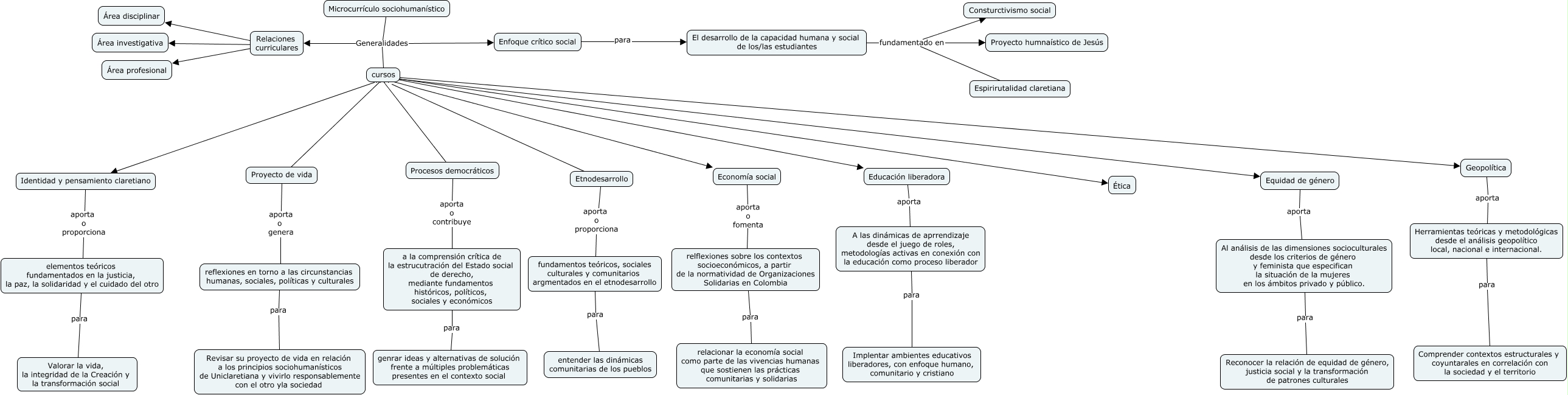 Este Cmap, tiene información relacionada con: Microcurrículo sociohumanístico, A las dinámicas de aprrendizaje desde el juego de roles, metodologías activas en conexión con la educación como proceso liberador para Implentar ambientes educativos liberadores, con enfoque humano, comunitario y cristiano, elementos teóricos fundamentados en la justicia, la paz, la solidaridad y el cuidado del otro para Valorar la vida, la integridad de la Creación y la transformación social, El desarrollo de la capacidad humana y social de los/las estudiantes fundamentado en Proyecto humnaístico de Jesús, Microcurrículo sociohumanístico Generalidades Relaciones curriculares, Procesos democráticos aporta o contribuye a la comprensión crítica de la estrucutración del Estado social de derecho, mediante fundamentos históricos, políticos, sociales y económicos, cursos ???? Proyecto de vida, El desarrollo de la capacidad humana y social de los/las estudiantes fundamentado en Proyecto humnaístico de Jesús, Etnodesarrollo aporta o proporciona fundamentos teóricos, sociales culturales y comunitarios argmentados en el etnodesarrollo, Equidad de género aporta Al análisis de las dimensiones socioculturales desde los criterios de género y feminista que especifican la situación de la mujeres en los ámbitos privado y público., cursos ???? Educación liberadora, cursos ???? Geopolítica, a la comprensión crítica de la estrucutración del Estado social de derecho, mediante fundamentos históricos, políticos, sociales y económicos para genrar ideas y alternativas de solución frente a múltiples problemáticas presentes en el contexto social, Microcurrículo sociohumanístico Generalidades cursos, Enfoque crítico social para El desarrollo de la capacidad humana y social de los/las estudiantes, reflexiones en torno a las circunstancias humanas, sociales, políticas y culturales para Revisar su proyecto de vida en relación a los principios sociohumanísticos de Uniclaretiana y vivirlo responsablemente con el otro yla sociedad, Educación liberadora aporta A las dinámicas de aprrendizaje desde el juego de roles, metodologías activas en conexión con la educación como proceso liberador, Relaciones curriculares ???? Área disciplinar, El desarrollo de la capacidad humana y social de los/las estudiantes fundamentado en Consturctivismo social, cursos ???? Ética, cursos ???? Economía social