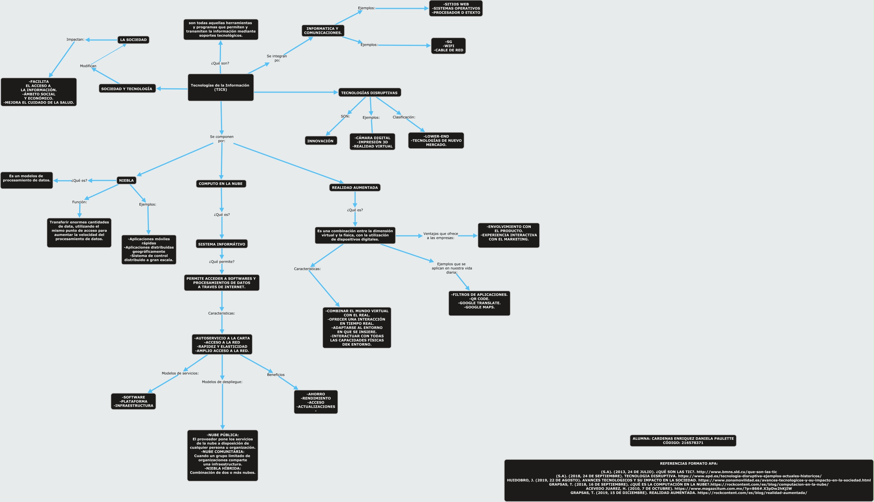 Este Cmap, tiene información relacionada con: Tecnologías Disruptivas, Tendencias y Cómputo en la Nube, -AUTOSERVICIO A LA CARTA -ACCESO A LA RED -RAPIDEZ Y ELASTICIDAD -AMPLIO ACCESO A LA RED. Beneficios -AHORRO -RENDIMIENTO -ACCESO -ACTUALIZACIONES -, INFORMATICA Y COMUNICACIONES. Ejemplos: -SITIOS WEB -SISTEMAS OPERATIVOS -PROCESADOR D ETEXTO, Tecnologías de la Información (TICS) ???? TECNOLOGÍAS DISRUPTIVAS, SOCIEDAD Y TECNOLOGÍA Modifican LA SOCIEDAD, INFORMATICA Y COMUNICACIONES. Ejemplos: -SG -WIFI -CABLE DE RED, REALIDAD AUMENTADA ¿Qué es? Es una combinación entre la dimensión virtual y la física, con la utilización de dispositivos digitales., Tecnologías de la Información (TICS) Se integran po: INFORMATICA Y COMUNICACIONES., SISTEMA INFORMÁTIVO ¿Qué permite? PERMITE ACCEDER A SOFTWARES Y PROCESAMIENTOS DE DATOS A TRAVES DE INTERNET., Tecnologías de la Información (TICS) Se componen por: COMPUTO EN LA NUBE, Tecnologías de la Información (TICS) ¿Qué son? son todas aquellas herramientas y programas que permiten y transmiten la información mediante soportes tecnológicos., Es una combinación entre la dimensión virtual y la física, con la utilización de dispositivos digitales. Ventajas que ofrece a las empresas: -ENVOLVIMIENTO CON EL PRODUCTO. -EXPERIENCIA INTERACTIVA CON EL MARKETING., PERMITE ACCEDER A SOFTWARES Y PROCESAMIENTOS DE DATOS A TRAVES DE INTERNET. Caracteristicas: -AUTOSERVICIO A LA CARTA -ACCESO A LA RED -RAPIDEZ Y ELASTICIDAD -AMPLIO ACCESO A LA RED., Tecnologías de la Información (TICS) Se componen por: NIEBLA, COMPUTO EN LA NUBE ¿Qué es? SISTEMA INFORMÁTIVO, NIEBLA Ejemplos: -Aplicaciones móviles rápidas -Aplicaciones distribuidas geográficamente -Sistema de control distribuido a gran escala., Es una combinación entre la dimensión virtual y la física, con la utilización de dispositivos digitales. Ejemplos que se aplican en nuestra vida diaria: -FILTROS DE APLICACIONES. -QR CODE. -GOOGLE TRANSLATE. -GOOGLE MAPS., -AUTOSERVICIO A LA CARTA -ACCESO A LA RED -RAPIDEZ Y ELASTICIDAD -AMPLIO ACCESO A LA RED. Modelos de servicios: -SOFTWARE -PLATAFORMA -INFRAESTRUCTURA, NIEBLA Función: Transferir enormes cantidades de data, utilizando el mismo punto de acceso para aumentar la velocidad del procesamiento de datos., NIEBLA ¿Qué es? Es un modelos de procesamiento de datos., -AUTOSERVICIO A LA CARTA -ACCESO A LA RED -RAPIDEZ Y ELASTICIDAD -AMPLIO ACCESO A LA RED. Modelos de despliegue: -NUBE PÚBLICA: El proveedor pone los servicios de la nube a disposición de cualquier persona u organización. -NUBE COMUNITARIA: Cuando un grupo limitado de organizaciones comparte una infraestructura. -NIEBLA HÍBRIDA: Combinación de dos o más nubes.
