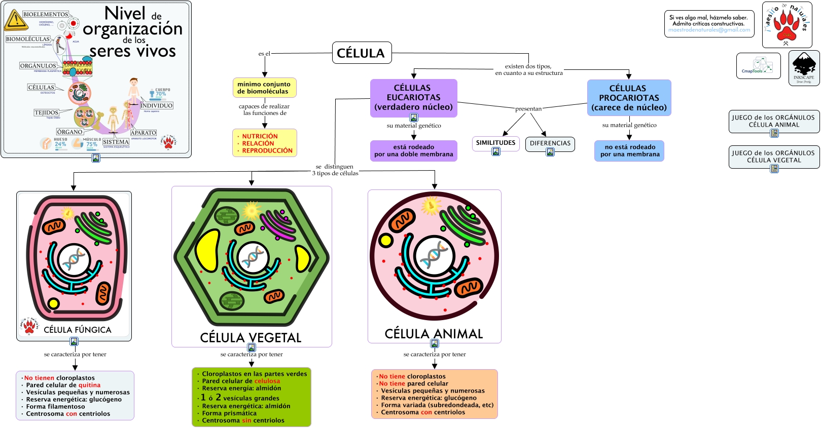 Este Cmap, tiene información relacionada con: Tema 01.05 La célula eucariota, CÉLULAS EUCARIOTAS (verdadero núcleo) se distinguen 3 tipos de células, se caracteriza por tener · Cloroplastos en las partes verdes · Pared celular de celulosa · Reserva energía: almidón · 1 ó 2 vesículas grandes · Reserva energética: almidón · Forma prismática · Centrosoma sin centriolos, CÉLULAS PROCARIOTAS (carece de núcleo) su material genético no está rodeado por una membrana, CÉLULAS PROCARIOTAS (carece de núcleo) presentan DIFERENCIAS, se caracteriza por tener · No tiene cloroplastos · No tiene pared celular · Vesículas pequeñas y numerosas · Reserva energética: glucógeno · Forma variada (subredondeada, etc) · Centrosoma con centriolos, CÉLULAS EUCARIOTAS (verdadero núcleo) se distinguen 3 tipos de células, CÉLULA es el mínimo conjunto de biomoléculas, CÉLULA existen dos tipos, en cuanto a su estructura CÉLULAS PROCARIOTAS (carece de núcleo), CÉLULA existen dos tipos, en cuanto a su estructura CÉLULAS EUCARIOTAS (verdadero núcleo), CÉLULAS EUCARIOTAS (verdadero núcleo) su material genético está rodeado por una doble membrana, CÉLULAS EUCARIOTAS (verdadero núcleo) presentan DIFERENCIAS, CÉLULAS PROCARIOTAS (carece de núcleo) presentan SIMILITUDES, mínimo conjunto de biomoléculas capaces de realizar las funciones de · NUTRICIÓN · RELACIÓN · REPRODUCCIÓN, CÉLULAS EUCARIOTAS (verdadero núcleo) presentan SIMILITUDES, CÉLULAS EUCARIOTAS (verdadero núcleo) se distinguen 3 tipos de células, se caracteriza por tener · No tienen cloroplastos · Pared celular de quitina · Vesículas pequeñas y numerosas · Reserva energética: glucógeno · Forma filamentoso · Centrosoma con centriolos