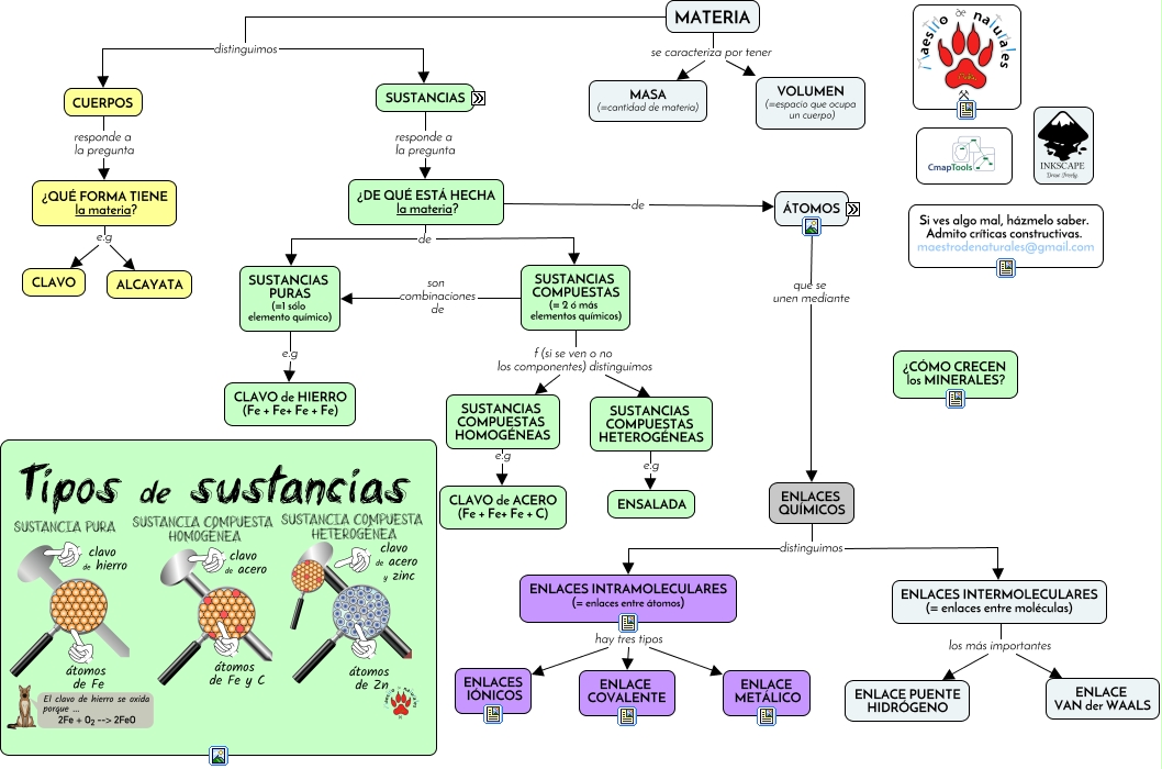 Este Cmap, tiene información relacionada con: 2.1 Qué es la materia, 1 sólo ELEMENTO QUÍMICO recibe el nombre de SUSTANCIAS PURAS (=1 sólo elemento químico), ¿QUÉ FORMA TIENE la materia? e.g CLAVO, IÓN distinguimos IÓN POSITIVO (=catión) PIERDE ELECTRÓN, SUSTANCIAS COMPUESTAS HETEROGÉNEAS e.g ENSALADA, SUSTANCIAS COMPUESTAS (= 2 ó más elementos químicos) f (si se ven o no los componentes) distinguimos SUSTANCIAS COMPUESTAS HOMOGÉNEAS, SUSTANCIAS COMPUESTAS HOMOGÉNEAS e.g CLAVO de ACERO (Fe + Fe+ Fe + C), CUERPOS responde a la pregunta ¿QUÉ FORMA TIENE la materia?, MATERIA se caracteriza por tener MASA (=cantidad de materia), ENLACES INTERMOLECULARES (= enlaces entre moléculas) los más importantes ENLACE VAN der WAALS, SUSTANCIAS responde a la pregunta ¿DE QUÉ ESTÁ HECHA la materia?, ¿QUÉ FORMA TIENE la materia? e.g ALCAYATA, SUSTANCIAS COMPUESTAS (= 2 ó más elementos químicos) son combinaciones de SUSTANCIAS PURAS (=1 sólo elemento químico), METÁLICO surgen SÓLIDOS IÓNICOS, IÓN distinguimos IÓN NEGATIVO (=anión) GANA ELECTRÓN, ¿DE QUÉ ESTÁ HECHA la materia? de ÁTOMOS, SUSTANCIAS COMPUESTAS HETEROGÉNEAS e.g ENSALADA, TIPO de ENLACE si el enlace es METÁLICO, MATERIA distinguimos SUSTANCIAS, SUSTANCIAS PURAS (=1 sólo elemento químico) e.g CLAVO de HIERRO (Fe + Fe+ Fe + Fe), Nº ELEMENTOS QUÍMICOS si hay 1 sólo ELEMENTO QUÍMICO