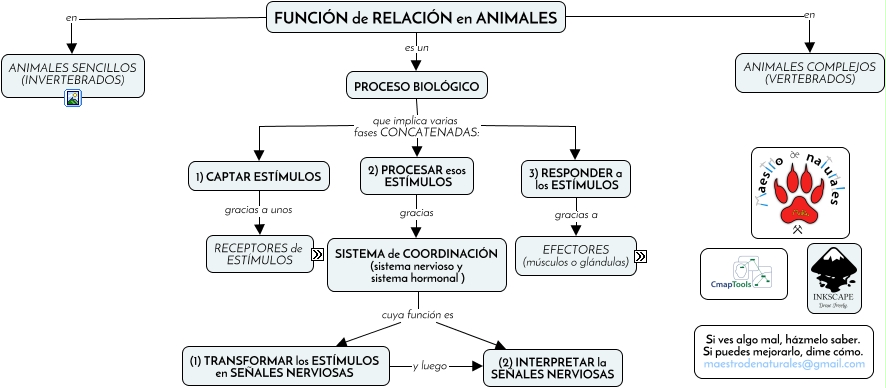 Este Cmap, tiene información relacionada con: Tema 06.06.03 Función RELACIÓN en el reino animal, CAPTAR ESTÍMULOS los cuales se clasifican en función TIPO de ESTÍMULO, LOS EFECTORES son los GLÁNDULAS, SISTEMA de COORDINACIÓN (sistema nervioso y sistema hormonal ) cuya función es (2) INTERPRETAR la SEÑALES NERVIOSAS, FUNCIÓN de RELACIÓN en ANIMALES en ANIMALES SENCILLOS (INVERTEBRADOS), 1) CAPTAR ESTÍMULOS gracias a unos RECEPTORES de ESTÍMULOS, SISTEMA de COORDINACIÓN (sistema nervioso y sistema hormonal ) cuya función es (1) TRANSFORMAR los ESTÍMULOS en SEÑALES NERVIOSAS, EXTERORRECEPTORES - provienen fuera del animal- por ejemplo TACTO, GLÁNDULAS pueden ser ENDOCRINAS, ÓRGANOS RECEPTORES cuya función es CAPTAR ESTÍMULOS, (1) TRANSFORMAR los ESTÍMULOS en SEÑALES NERVIOSAS y luego (2) INTERPRETAR la SEÑALES NERVIOSAS, MEMBRANA PLASMÁTICA de la CÉLULA DIANA desencadena REACCIONES QUÍMICAS INTRACELULARES, CAPTAR ESTÍMULOS los cuales se clasifican en función PROCEDENCIA del ESTÍMULO, TIPO de ESTÍMULO distinguimos MECANORRECEPTORES -Iinforman sobre variaciones de presión, roce, sonido, gravedad, etc-, PROCESO BIOLÓGICO que implica varias fases CONCATENADAS: 3) RESPONDER a los ESTÍMULOS, TIPO de ESTÍMULO distinguimos TERMORRECEPTORES -Iinforman sobre variaciones de temperatura-, HORMONAS (= moléculas orgánicas del sistema endocrino) que al llegar MEMBRANA PLASMÁTICA de la CÉLULA DIANA, MÚSCULOS que al CONTRAERSE/RELAJARSE cuando recibe un IMPULSO NERVIOSO, ENDOCRINAS por ejemplo NEUROTRANSMISORES (= moléculas orgánicas del sistema nervioso), 1 ó VARIAS CÉLULAS ESPECIALIZADAS cuya función es CAPTAR ESTÍMULOS, FUNCIÓN de RELACIÓN en ANIMALES es un PROCESO BIOLÓGICO