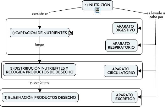 Este Cmap, tiene información relacionada con: 3.1 La nutrición humana, 1) CAPTACIÓN DE NUTRIENTES ¿cuáles? <math xmlns="http://www.w3.org/1998/Math/MathML"> <mrow> <mmultiscripts> <mtext> O </mtext> <mtext> 2 </mtext> <none/> </mmultiscripts> <mtext> (oxígeno) </mtext> </mrow> </math>, 3.1 NUTRICIÓN es llevada a cabo por APARATO DIGESTIVO, 3.1 NUTRICIÓN es llevada a cabo por APARATO EXCRETOR, 2) DISTRIBUCIÓN NUTRIENTES Y RECOGIDA PRODUCTOS DE DESECHO y, por último 3) ELIMINACIÓN PRODUCTOS DESECHO, 1) CAPTACIÓN DE NUTRIENTES luego 2) DISTRIBUCIÓN NUTRIENTES Y RECOGIDA PRODUCTOS DE DESECHO, 3.1 NUTRICIÓN es llevada a cabo por APARATO RESPIRATORIO, 3.1 NUTRICIÓN consiste en 1) CAPTACIÓN DE NUTRIENTES, 1) CAPTACIÓN DE NUTRIENTES ¿cuáles? biomoléculas, 3.1 NUTRICIÓN es llevada a cabo por APARATO CIRCULATORIO