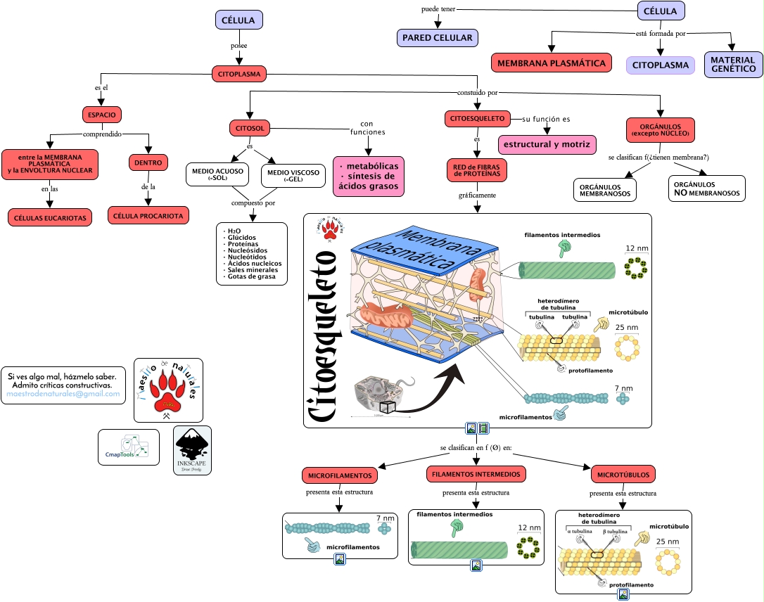 Este Cmap, tiene información relacionada con: Tema 01.06.03 Citoplasma, CÉLULA está formada por MATERIAL GENÉTICO, MEDIO ACUOSO (=SOL) compuesto por · H2O · Glúcidos · Proteínas · Nucleósidos · Nucleótidos · Ácidos nucleicos · Sales minerales · Gotas de grasa, CITOESQUELETO su función es estructural y motriz, ???? se clasifican en f (Ø) en: FILAMENTOS INTERMEDIOS, CITOPLASMA constuido por CITOSOL, CITOPLASMA es el ESPACIO, FILAMENTOS INTERMEDIOS presenta esta estructura, CITOPLASMA constuido por ORGÁNULOS (excepto NÚCLEO), CÉLULA está formada por CITOPLASMA, ORGÁNULOS (excepto NÚCLEO) se clasifican f(¿tienen membrana?) ORGÁNULOS NO MEMBRANOSOS, ESPACIO comprendido DENTRO, MICROFILAMENTOS presenta esta estructura, CÉLULA está formada por MEMBRANA PLASMÁTICA, CITOSOL es MEDIO ACUOSO (=SOL), CITOESQUELETO es RED de FIBRAS de PROTEÍNAS, RED de FIBRAS de PROTEÍNAS gráficamente ????, CITOSOL es MEDIO VISCOSO (=GEL), entre la MEMBRANA PLASMÁTICA y la ENVOLTURA NUCLEAR en las CÉLULAS EUCARIOTAS, ???? se clasifican en f (Ø) en: MICROTÚBULOS, CITOPLASMA constuido por CITOESQUELETO