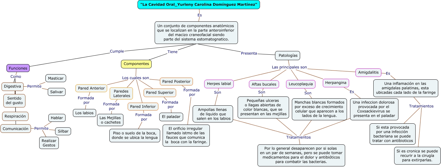 Este Cmap, tiene información relacionada con: Cavidad Oral, Un conjunto de componentes anatómicos que se localizan en la parte anteroinferior del macizo craneofacial siendo parte del sistema estomatognatico. Presenta Patologías, Herpes labial Son Ampollas llenas de liquido que salen en los labios, Componentes Los cuales son Paredes Laterales, Una inflamación en las amigdalas palatinas, esta ubicadas cada lado de la faringe Tratamientos Si esta provocada por una infección bacteriana se puede tratar con antibioticos, Patologías Las principales son Aftas bucales, Realizar Gestos Permite Hablar, Componentes Los cuales son Pared Posterior, Pared Anterior Formada por Los labios, "La Cavidad Oral_Yurleny Carolina Domínguez Martínez" Es Un conjunto de componentes anatómicos que se localizan en la parte anteroinferior del macizo craneofacial siendo parte del sistema estomatognatico., Pequeñas ulceras o llagas abiertas de color blancas, que se presentan en las mejillas Tratamientos Por lo general desaparecen por si solas en un par de semanas, pero se puede tomar medicamentos para el dolor y antibióticos para combatir las bacterias., Digestiva Permite Salivar, Una infeccion dolorosa provocada por el Coxsackievirus se presenta en el paladar Tratamientos Por lo general desaparecen por si solas en un par de semanas, pero se puede tomar medicamentos para el dolor y antibióticos para combatir las bacterias., Componentes Los cuales son Pared Anterior, Patologías Las principales son Amigdalitis, Manchas blancas formados por exceso de crecimiento celular que aparecen a los lados de la lengua. Tratamientos Por lo general desaparecen por si solas en un par de semanas, pero se puede tomar medicamentos para el dolor y antibióticos para combatir las bacterias., Funciones Como Sentido del gusto, Ampollas llenas de liquido que salen en los labios Tratamientos Por lo general desaparecen por si solas en un par de semanas, pero se puede tomar medicamentos para el dolor y antibióticos para combatir las bacterias., Una inflamación en las amigdalas palatinas, esta ubicadas cada lado de la faringe Tratamientos Si es cronica se puede recurir a la cirugía para extirparlas., Herpangina Es Una infeccion dolorosa provocada por el Coxsackievirus se presenta en el paladar, Patologías Las principales son Herpangina
