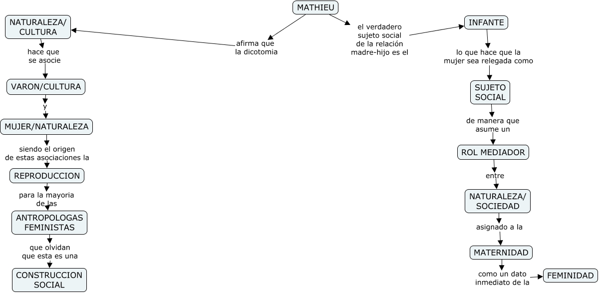 Este Cmap, tiene información relacionada con: C6Mathieu complemento Sacks, MUJER/NATURALEZA siendo el origen de estas asociaciones la REPRODUCCION, ROL MEDIADOR entre NATURALEZA/ SOCIEDAD, MATERNIDAD como un dato inmediato de la FEMINIDAD, REPRODUCCION para la mayoria de las ANTROPOLOGAS FEMINISTAS, MATHIEU afirma que la dicotomia NATURALEZA/ CULTURA, VARON/CULTURA y MUJER/NATURALEZA, MATHIEU el verdadero sujeto social de la relación madre-hijo es el INFANTE, NATURALEZA/ SOCIEDAD asignado a la MATERNIDAD, NATURALEZA/ CULTURA hace que se asocie VARON/CULTURA, ANTROPOLOGAS FEMINISTAS que olvidan que esta es una CONSTRUCCION SOCIAL, SUJETO SOCIAL de manera que asume un ROL MEDIADOR, INFANTE lo que hace que la mujer sea relegada como SUJETO SOCIAL