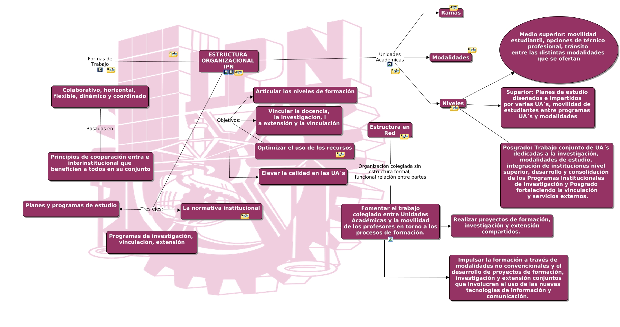 This Concept Map, created with IHMC CmapTools, has information related to: ESTRUCTURAORGANIZACIONAL_DBBG, ESTRUCTURA ORGANIZACIONAL IPN Unidades Académicas Estructura en Red, ESTRUCTURA ORGANIZACIONAL IPN Tres ejes: La normativa institucional, ESTRUCTURA ORGANIZACIONAL IPN Formas de Trabajo Colaborativo, horizontal, flexible, dinámico y coordinado, Niveles ???? Superior: Planes de estudio diseñados e impartidos por varias UA´s, movilidad de estudiantes entre programas UA´s y modalidades, ESTRUCTURA ORGANIZACIONAL IPN Objetivos: Vincular la docencia, la investigación, l a extensión y la vinculación, ESTRUCTURA ORGANIZACIONAL IPN Unidades Académicas Modalidades, ESTRUCTURA ORGANIZACIONAL IPN Unidades Académicas Niveles, ESTRUCTURA ORGANIZACIONAL IPN Tres ejes: Planes y programas de estudio, Colaborativo, horizontal, flexible, dinámico y coordinado Basadas en: Principios de cooperación entra e interinstitucional que beneficien a todos en su conjunto, ESTRUCTURA ORGANIZACIONAL IPN Tres ejes: Programas de investigación, vinculación, extensión, Niveles ???? Posgrado: Trabajo conjunto de UA´s dedicadas a la investigación, modalidades de estudio, integración de instituciones nivel superior, desarrollo y consolidación de los Programas Institucionales de Investigación y Posgrado fortaleciendo la vinculación y servicios externos., Fomentar el trabajo colegiado entre Unidades Académicas y la movilidad de los profesores en torno a los procesos de formación. ???? Realizar proyectos de formación, investigación y extensión compartidos., ESTRUCTURA ORGANIZACIONAL IPN Objetivos: Elevar la calidad en las UA´s, ESTRUCTURA ORGANIZACIONAL IPN Objetivos: Optimizar el uso de los recursos, Niveles ???? Medio superior: movilidad estudiantil, opciones de técnico profesional, tránsito entre las distintas modalidades que se ofertan, ESTRUCTURA ORGANIZACIONAL IPN Unidades Académicas Ramas, ESTRUCTURA ORGANIZACIONAL IPN Objetivos: Articular los niveles de formación, Fomentar el trabajo colegiado entre Unidades Académicas y la movilidad de los profesores en torno a los procesos de formación. ???? Impulsar la formación a través de modalidades no convencionales y el desarrollo de proyectos de formación, investigación y extensión conjuntos que involucren el uso de las nuevas tecnologías de información y comunicación., Estructura en Red Organización colegiada sin estructura formal, funcional relación entre partes Fomentar el trabajo colegiado entre Unidades Académicas y la movilidad de los profesores en torno a los procesos de formación.