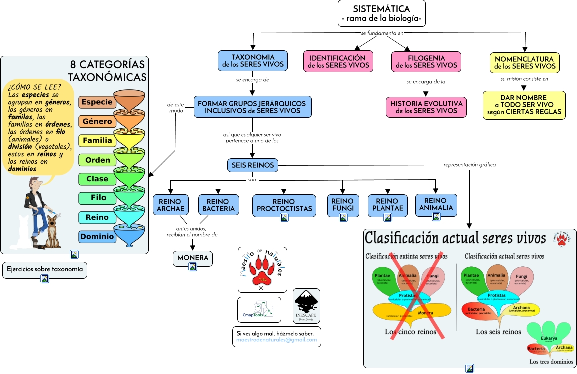 Este Cmap, tiene información relacionada con: Tema 04.05.01 Sistema de clasificación de los seres vivos, SEIS REINOS son REINO BACTERIA, FILOGENIA de los SERES VIVOS se encarga de la HISTORIA EVOLUTIVA de los SERES VIVOS, SISTEMÁTICA - rama de la biología- se fundamenta en IDENTIFICACIÓN de los SERES VIVOS, FORMAR GRUPOS JERÁRQUICOS INCLUSIVOS de SERES VIVOS así que cualquier ser vivo pertenece a uno de los SEIS REINOS, SEIS REINOS son REINO ANIMALIA, SEIS REINOS son REINO PLANTAE, SEIS REINOS son REINO FUNGI, REINO BACTERIA antes unidos, recibían el nombre de MONERA, REINO ARCHAE antes unidos, recibían el nombre de MONERA, SEIS REINOS son REINO PROCTOCTISTAS, SEIS REINOS representación gráfica, SEIS REINOS son REINO ARCHAE, FORMAR GRUPOS JERÁRQUICOS INCLUSIVOS de SERES VIVOS de este modo, TAXONOMIA de los SERES VIVOS se encarga de FORMAR GRUPOS JERÁRQUICOS INCLUSIVOS de SERES VIVOS, SISTEMÁTICA - rama de la biología- se fundamenta en NOMENCLATURA de los SERES VIVOS, SISTEMÁTICA - rama de la biología- se fundamenta en TAXONOMIA de los SERES VIVOS, NOMENCLATURA de los SERES VIVOS su misión consiste en DAR NOMBRE a TODO SER VIVO según CIERTAS REGLAS, SISTEMÁTICA - rama de la biología- se fundamenta en FILOGENIA de los SERES VIVOS