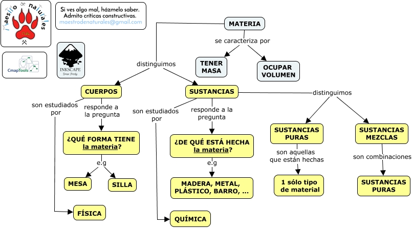Este Cmap, tiene información relacionada con: Qué es la materia, MATERIA distinguimos SUSTANCIAS, ¿DE QUÉ ESTÁ HECHA la materia? e.g MADERA, METAL, PLÁSTICO, BARRO, ..., SUSTANCIAS distinguimos SUSTANCIAS MEZCLAS, CUERPOS son estudiados por FÍSICA, SUSTANCIAS MEZCLAS son combinaciones SUSTANCIAS PURAS, ¿QUÉ FORMA TIENE la materia? e.g SILLA, SUSTANCIAS PURAS son aquellas que están hechas 1 sólo tipo de material, MATERIA se caracteriza por OCUPAR VOLUMEN, MATERIA distinguimos CUERPOS, SUSTANCIAS responde a la pregunta ¿DE QUÉ ESTÁ HECHA la materia?, CUERPOS responde a la pregunta ¿QUÉ FORMA TIENE la materia?, SUSTANCIAS distinguimos SUSTANCIAS PURAS, ¿QUÉ FORMA TIENE la materia? e.g MESA, SUSTANCIAS son estudiados por QUÍMICA, MATERIA se caracteriza por TENER MASA