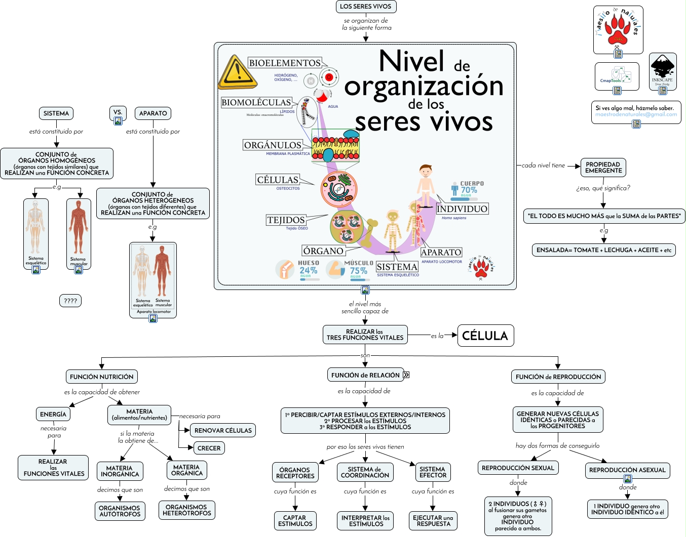 Este Cmap, tiene información relacionada con: Tema 04.03 Funciones vitales, SISTEMA EFECTOR cuya función es EJECUTAR una RESPUESTA, REALIZAR las TRES FUNCIONES VITALES es la CÉLULA, CONJUNTO de ÓRGANOS HETERÓGENEOS (órganos con tejidos diferentes) que REALIZAN una FUNCIÓN CONCRETA e.g, REPRODUCCIÓN SEXUAL donde 2 INDIVIDUOS (♂♀) al fusionar sus gametos genera otro INDIVIDUO parecido a ambos., cada nivel tiene PROPIEDAD EMERGENTE, LOS SERES VIVOS se organizan de la siguiente forma, 1º PERCIBIR/CAPTAR ESTÍMULOS EXTERNOS/INTERNOS 2º PROCESAR los ESTÍMULOS 3º RESPONDER a los ESTÍMULOS por eso los seres vivos tienen SISTEMA de COORDINACIÓN, ENERGÍA necesaria para REALIZAR las FUNCIONES VITALES, FUNCIÓN de REPRODUCCIÓN es la capacidad de GENERAR NUEVAS CÉLULAS IDÉNTICAS o PARECIDAS a los PROGENITORES, MATERIA ORGÁNICA decimos que son ORGANISMOS HETERÓTROFOS, MATERIA INORGÁNICA decimos que son ORGANISMOS AUTÓTROFOS, MATERIA (alimentos/nutrientes) necesaria para CRECER, 1) CAPTAR ESTÍMULOS gracias a unos RECEPTORES de ESTÍMULOS, FUNCIÓN NUTRICIÓN es la capacidad de obtener ENERGÍA, "EL TODO ES MUCHO MÁS que la SUMA de las PARTES" e.g ENSALADA= TOMATE + LECHUGA + ACEITE + etc, FUNCIÓN NUTRICIÓN es la capacidad de obtener MATERIA (alimentos/nutrientes), GENERAR NUEVAS CÉLULAS IDÉNTICAS o PARECIDAS a los PROGENITORES hay dos formas de conseguirlo REPRODUCCIÓN SEXUAL, REALIZAR las TRES FUNCIONES VITALES son FUNCIÓN NUTRICIÓN, SISTEMA de COORDINACIÓN (sistema nervioso y sistema hormonal ) cuya función es (1) TRANSFORMAR los ESTÍMULOS en SEÑALES NERVIOSAS, MATERIA (alimentos/nutrientes) si la materia la obtiene de... MATERIA INORGÁNICA
