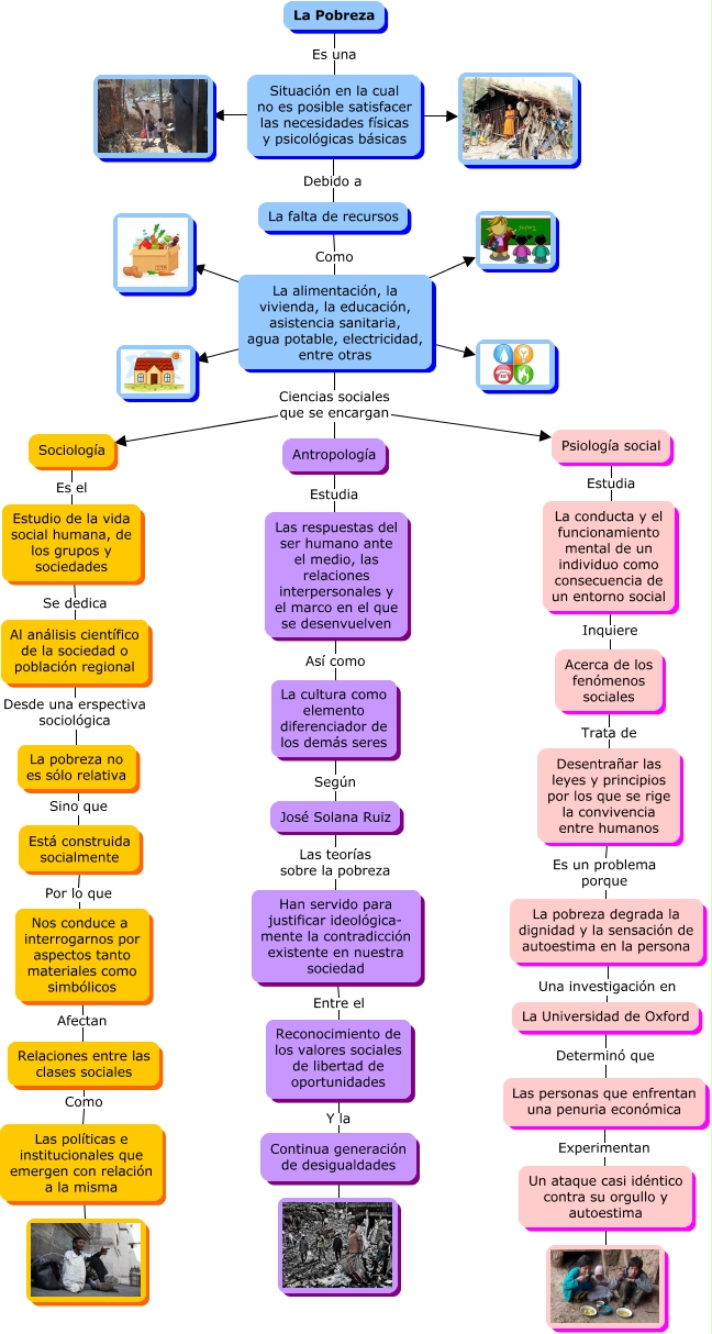 Este Cmap, tiene información relacionada con: MAPA ICS POBREZA, Acerca de los fenómenos sociales Trata de Desentrañar las leyes y principios por los que se rige la convivencia entre humanos, Un ataque casi idéntico contra su orgullo y autoestima ????, Relaciones entre las clases sociales Como Las políticas e institucionales que emergen con relación a la misma, Estudio de la vida social humana, de los grupos y sociedades Se dedica Al análisis científico de la sociedad o población regional, La alimentación, la vivienda, la educación, asistencia sanitaria, agua potable, electricidad, entre otras Ciencias sociales que se encargan Sociología, La alimentación, la vivienda, la educación, asistencia sanitaria, agua potable, electricidad, entre otras ????, Psiología social Estudia La conducta y el funcionamiento mental de un individuo como consecuencia de un entorno social, Desentrañar las leyes y principios por los que se rige la convivencia entre humanos Es un problema porque La pobreza degrada la dignidad y la sensación de autoestima en la persona, La falta de recursos Como La alimentación, la vivienda, la educación, asistencia sanitaria, agua potable, electricidad, entre otras, Continua generación de desigualdades ????, La pobreza no es sólo relativa Sino que Está construida socialmente, La conducta y el funcionamiento mental de un individuo como consecuencia de un entorno social Inquiere Acerca de los fenómenos sociales, Antropología Estudia Las respuestas del ser humano ante el medio, las relaciones interpersonales y el marco en el que se desenvuelven, Situación en la cual no es posible satisfacer las necesidades físicas y psicológicas básicas ????, Nos conduce a interrogarnos por aspectos tanto materiales como simbólicos Afectan Relaciones entre las clases sociales, La pobreza degrada la dignidad y la sensación de autoestima en la persona Una investigación en La Universidad de Oxford, Las respuestas del ser humano ante el medio, las relaciones interpersonales y el marco en el que se desenvuelven Así como La cultura como elemento diferenciador de los demás seres, La alimentación, la vivienda, la educación, asistencia sanitaria, agua potable, electricidad, entre otras ????, Han servido para justificar ideológica- mente la contradicción existente en nuestra sociedad Entre el Reconocimiento de los valores sociales de libertad de oportunidades, Las personas que enfrentan una penuria económica Experimentan Un ataque casi idéntico contra su orgullo y autoestima