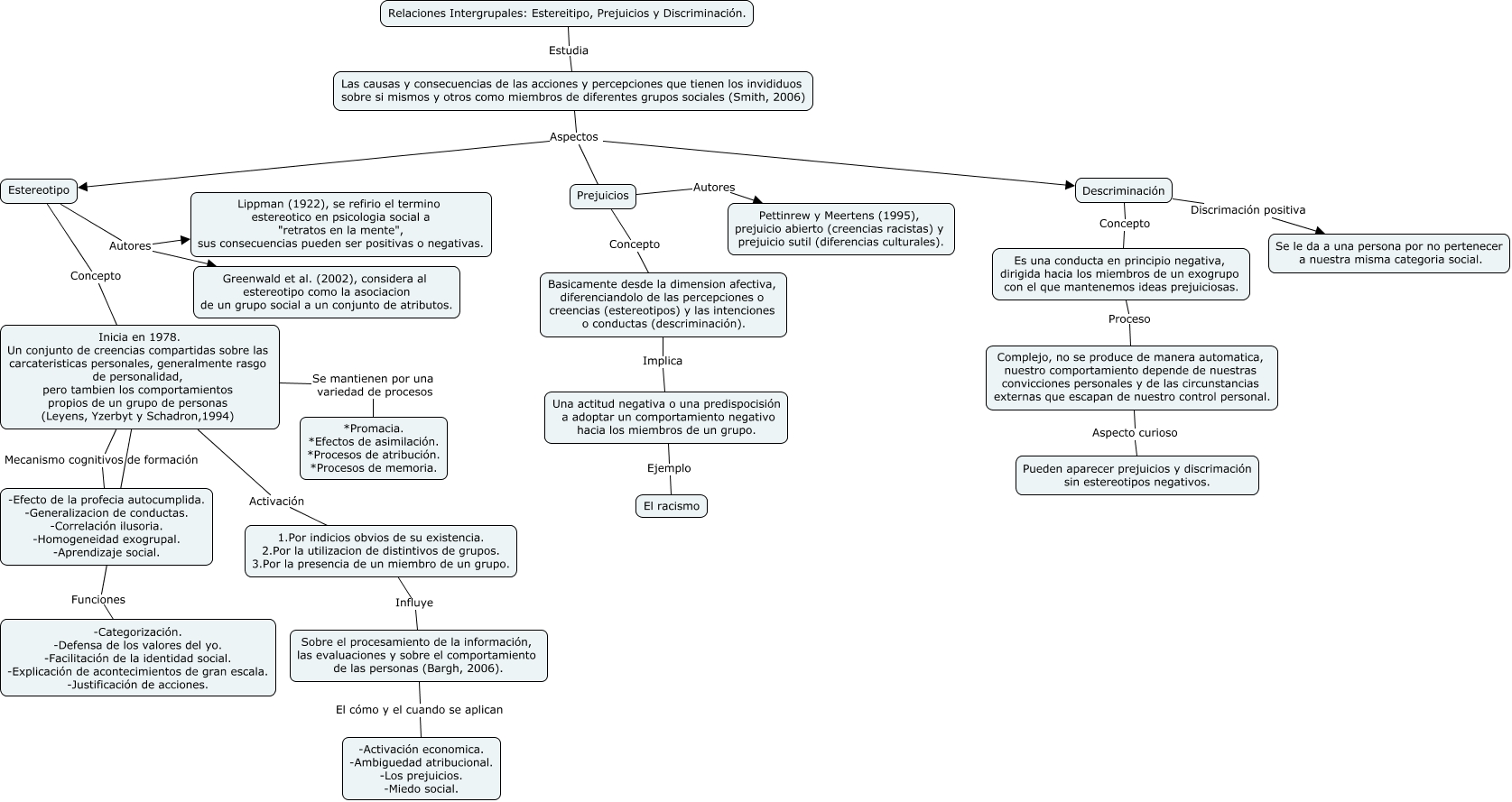 Este Cmap, tiene información relacionada con: Mapa conceptual, Inicia en 1978. Un conjunto de creencias compartidas sobre las carcateristicas personales, generalmente rasgo de personalidad, pero tambien los comportamientos propios de un grupo de personas (Leyens, Yzerbyt y Schadron,1994) Activación 1.Por indicios obvios de su existencia. 2.Por la utilizacion de distintivos de grupos. 3.Por la presencia de un miembro de un grupo., Sobre el procesamiento de la información, las evaluaciones y sobre el comportamiento de las personas (Bargh, 2006). El cómo y el cuando se aplican -Activación economica. -Ambiguedad atribucional. -Los prejuicios. -Miedo social., Estereotipo Autores Greenwald et al. (2002), considera al estereotipo como la asociacion de un grupo social a un conjunto de atributos., Estereotipo Autores Lippman (1922), se refirio el termino estereotico en psicologia social a "retratos en la mente", sus consecuencias pueden ser positivas o negativas., Prejuicios Concepto Basicamente desde la dimension afectiva, diferenciandolo de las percepciones o creencias (estereotipos) y las intenciones o conductas (descriminación)., Es una conducta en principio negativa, dirigida hacia los miembros de un exogrupo con el que mantenemos ideas prejuiciosas. Proceso Complejo, no se produce de manera automatica, nuestro comportamiento depende de nuestras convicciones personales y de las circunstancias externas que escapan de nuestro control personal., Inicia en 1978. Un conjunto de creencias compartidas sobre las carcateristicas personales, generalmente rasgo de personalidad, pero tambien los comportamientos propios de un grupo de personas (Leyens, Yzerbyt y Schadron,1994) Se mantienen por una variedad de procesos *Promacia. *Efectos de asimilación. *Procesos de atribución. *Procesos de memoria., Relaciones Intergrupales: Estereitipo, Prejuicios y Discriminación. Estudia Las causas y consecuencias de las acciones y percepciones que tienen los invididuos sobre si mismos y otros como miembros de diferentes grupos sociales (Smith, 2006), Inicia en 1978. Un conjunto de creencias compartidas sobre las carcateristicas personales, generalmente rasgo de personalidad, pero tambien los comportamientos propios de un grupo de personas (Leyens, Yzerbyt y Schadron,1994) Mecanismo cognitivos de formación -Efecto de la profecia autocumplida. -Generalizacion de conductas. -Correlación ilusoria. -Homogeneidad exogrupal. -Aprendizaje social., Prejuicios Autores Pettinrew y Meertens (1995), prejuicio abierto (creencias racistas) y prejuicio sutil (diferencias culturales)., Las causas y consecuencias de las acciones y percepciones que tienen los invididuos sobre si mismos y otros como miembros de diferentes grupos sociales (Smith, 2006) Aspectos Prejuicios, Descriminación Discrimación positiva Se le da a una persona por no pertenecer a nuestra misma categoria social., 1.Por indicios obvios de su existencia. 2.Por la utilizacion de distintivos de grupos. 3.Por la presencia de un miembro de un grupo. Influye Sobre el procesamiento de la información, las evaluaciones y sobre el comportamiento de las personas (Bargh, 2006)., Las causas y consecuencias de las acciones y percepciones que tienen los invididuos sobre si mismos y otros como miembros de diferentes grupos sociales (Smith, 2006) Aspectos Estereotipo, Las causas y consecuencias de las acciones y percepciones que tienen los invididuos sobre si mismos y otros como miembros de diferentes grupos sociales (Smith, 2006) Aspectos Descriminación, Descriminación Concepto Es una conducta en principio negativa, dirigida hacia los miembros de un exogrupo con el que mantenemos ideas prejuiciosas., Una actitud negativa o una predispocisión a adoptar un comportamiento negativo hacia los miembros de un grupo. Ejemplo El racismo, Inicia en 1978. Un conjunto de creencias compartidas sobre las carcateristicas personales, generalmente rasgo de personalidad, pero tambien los comportamientos propios de un grupo de personas (Leyens, Yzerbyt y Schadron,1994) Funciones -Categorización. -Defensa de los valores del yo. -Facilitación de la identidad social. -Explicación de acontecimientos de gran escala. -Justificación de acciones., Complejo, no se produce de manera automatica, nuestro comportamiento depende de nuestras convicciones personales y de las circunstancias externas que escapan de nuestro control personal. Aspecto curioso Pueden aparecer prejuicios y discrimación sin estereotipos negativos., Basicamente desde la dimension afectiva, diferenciandolo de las percepciones o creencias (estereotipos) y las intenciones o conductas (descriminación). Implica Una actitud negativa o una predispocisión a adoptar un comportamiento negativo hacia los miembros de un grupo.