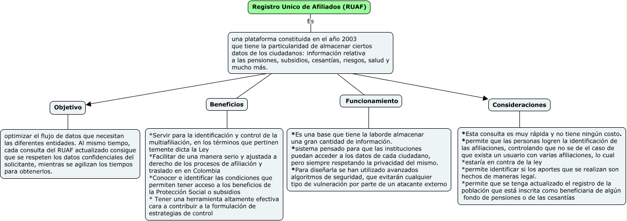 Este Cmap, tiene información relacionada con: RUAF, una plataforma constituida en el año 2003 que tiene la particularidad de almacenar ciertos datos de los ciudadanos: información relativa a las pensiones, subsidios, cesantías, riesgos, salud y mucho más. ???? Consideraciones, una plataforma constituida en el año 2003 que tiene la particularidad de almacenar ciertos datos de los ciudadanos: información relativa a las pensiones, subsidios, cesantías, riesgos, salud y mucho más. ???? Objetivo, Beneficios ???? *Servir para la identificación y control de la multiafiliación, en los términos que pertinen temente dicta la Ley *Facilitar de una manera serio y ajustada a derecho de los procesos de afiliación y traslado en en Colombia *Conocer e identificar las condiciones que permiten tener acceso a los beneficios de la Protección Social o subsidios * Tener una herramienta altamente efectiva cara a contribuir a la formulación de estrategias de control, Consideraciones ???? *Esta consulta es muy rápida y no tiene ningún costo. *permite que las personas logren la identificación de las afiliaciones, controlando que no se de el caso de que exista un usuario con varias afiliaciones, lo cual *estaría en contra de la ley *permite identificar si los aportes que se realizan son hechos de maneras legal. *permite que se tenga actualizado el registro de la población que está inscrita como beneficiaria de algún fondo de pensiones o de las cesantías, Objetivo ???? optimizar el flujo de datos que necesitan las diferentes entidades. Al mismo tiempo, cada consulta del RUAF actualizado consigue que se respeten los datos confidenciales del solicitante, mientras se agilizan los tiempos para obtenerlos., una plataforma constituida en el año 2003 que tiene la particularidad de almacenar ciertos datos de los ciudadanos: información relativa a las pensiones, subsidios, cesantías, riesgos, salud y mucho más. ???? Beneficios, una plataforma constituida en el año 2003 que tiene la particularidad de almacenar ciertos datos de los ciudadanos: información relativa a las pensiones, subsidios, cesantías, riesgos, salud y mucho más. ???? Funcionamiento, Registro Unico de Afiliados (RUAF) Es una plataforma constituida en el año 2003 que tiene la particularidad de almacenar ciertos datos de los ciudadanos: información relativa a las pensiones, subsidios, cesantías, riesgos, salud y mucho más., Funcionamiento ???? *Es una base que tiene la laborde almacenar una gran cantidad de información. *sistema pensado para que las instituciones puedan acceder a los datos de cada ciudadano, pero siempre respetando la privacidad del mismo. *Para diseñarla se han utilizado avanzados algoritmos de seguridad, que evitarán cualquier tipo de vulneración por parte de un atacante externo