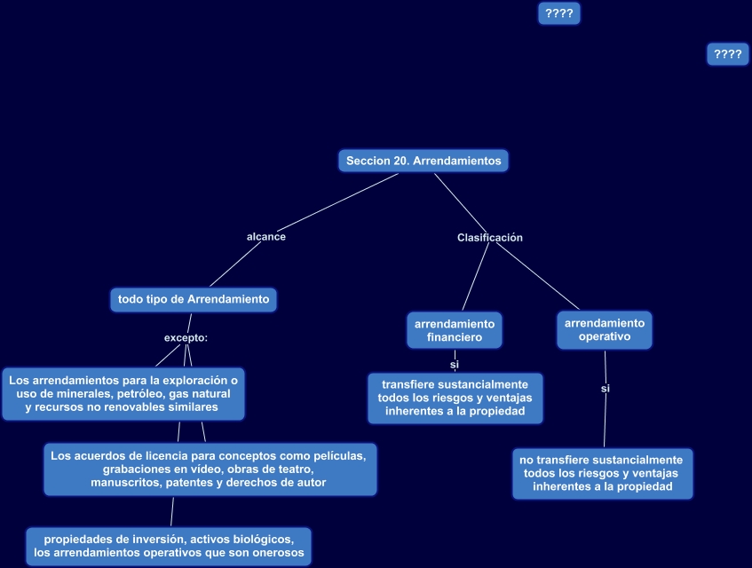 This Concept Map, created with IHMC CmapTools, has information related to: MiladisPerezSeccion20, Seccion 20. Arrendamientos Clasificación arrendamiento financiero, Seccion 20. Arrendamientos alcance todo tipo de Arrendamiento, Seccion 20. Arrendamientos Clasificación arrendamiento operativo, todo tipo de Arrendamiento excepto: Los acuerdos de licencia para conceptos como películas, grabaciones en vídeo, obras de teatro, manuscritos, patentes y derechos de autor, arrendamiento financiero si transfiere sustancialmente todos los riesgos y ventajas inherentes a la propiedad, arrendamiento operativo si no transfiere sustancialmente todos los riesgos y ventajas inherentes a la propiedad, todo tipo de Arrendamiento excepto: propiedades de inversión, activos biológicos, los arrendamientos operativos que son onerosos, todo tipo de Arrendamiento excepto: Los arrendamientos para la exploración o uso de minerales, petróleo, gas natural y recursos no renovables similares