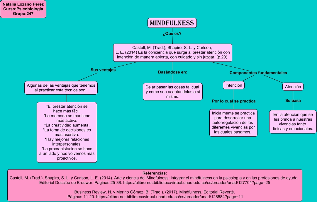 Este Cmap, tiene información relacionada con: mindfulness, Castell, M. (Trad.), Shapiro, S. L. y Carlson, L. E. (2014) Es la conciencia que surge al prestar atención con intención de manera abierta, con cuidado y sin juzgar. (p.29) Componentes fundamentales Atención, Castell, M. (Trad.), Shapiro, S. L. y Carlson, L. E. (2014) Es la conciencia que surge al prestar atención con intención de manera abierta, con cuidado y sin juzgar. (p.29) Basándose en: Dejar pasar las cosas tal cual y como son aceptándolas a si mismo., Castell, M. (Trad.), Shapiro, S. L. y Carlson, L. E. (2014) Es la conciencia que surge al prestar atención con intención de manera abierta, con cuidado y sin juzgar. (p.29) Componentes fundamentales Intención, Atención Se basa En la atención que se les brinda a nuestras vivencias tanto físicas y emocionales., Intención Por lo cual se practica Inicialmente se practica para desarrollar una autorregulación de las diferentes vivencias por las cuales pasamos., mindfulness ¿Que es? Castell, M. (Trad.), Shapiro, S. L. y Carlson, L. E. (2014) Es la conciencia que surge al prestar atención con intención de manera abierta, con cuidado y sin juzgar. (p.29), Algunas de las ventajas que tenemos al practicar esta técnica son: ???? *El prestar atención se hace más fácil. *La memoria se mantiene más activa. *La creatividad aumenta. *La toma de decisiones es más asertiva. *Hay mejores relaciones interpersonales. *La procranistacion se hace a un lado y nos volvemos mas proactivos., Castell, M. (Trad.), Shapiro, S. L. y Carlson, L. E. (2014) Es la conciencia que surge al prestar atención con intención de manera abierta, con cuidado y sin juzgar. (p.29) Sus ventajas Algunas de las ventajas que tenemos al practicar esta técnica son: