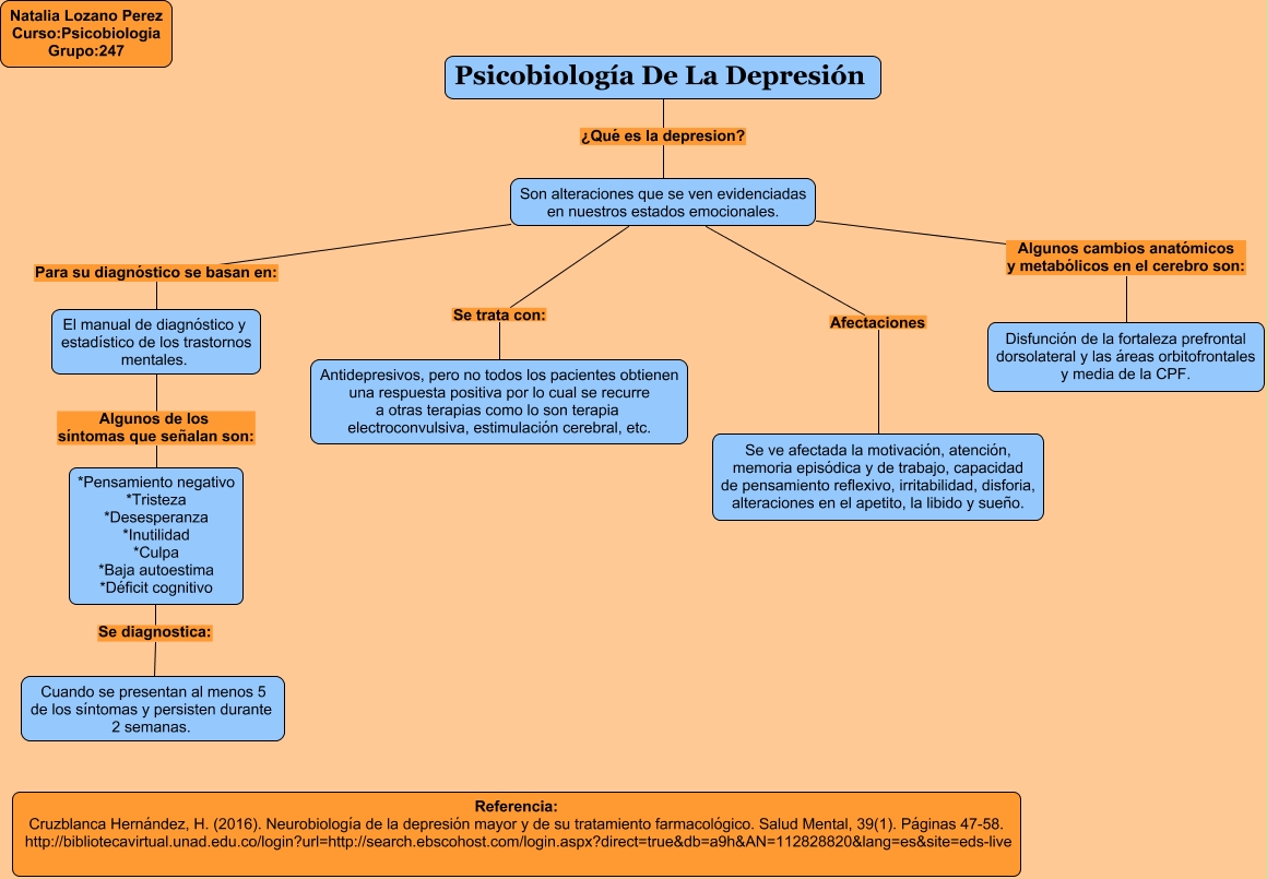 Este Cmap, tiene información relacionada con: Psicobiologia de la depresión, *Pensamiento negativo *Tristeza *Desesperanza *Inutilidad *Culpa *Baja autoestima *Déficit cognitivo Se diagnostica: Cuando se presentan al menos 5 de los síntomas y persisten durante 2 semanas., Son alteraciones que se ven evidenciadas en nuestros estados emocionales. Se trata con: Antidepresivos, pero no todos los pacientes obtienen una respuesta positiva por lo cual se recurre a otras terapias como lo son terapia electroconvulsiva, estimulación cerebral, etc., Son alteraciones que se ven evidenciadas en nuestros estados emocionales. Afectaciones Se ve afectada la motivación, atención, memoria episódica y de trabajo, capacidad de pensamiento reflexivo, irritabilidad, disforia, alteraciones en el apetito, la libido y sueño., Son alteraciones que se ven evidenciadas en nuestros estados emocionales. Para su diagnóstico se basan en: El manual de diagnóstico y estadístico de los trastornos mentales., Son alteraciones que se ven evidenciadas en nuestros estados emocionales. Algunos cambios anatómicos y metabólicos en el cerebro son: Disfunción de la fortaleza prefrontal dorsolateral y las áreas orbitofrontales y media de la CPF., Psicobiología De La Depresión ¿Qué es la depresion? Son alteraciones que se ven evidenciadas en nuestros estados emocionales., El manual de diagnóstico y estadístico de los trastornos mentales. Algunos de los síntomas que señalan son: *Pensamiento negativo *Tristeza *Desesperanza *Inutilidad *Culpa *Baja autoestima *Déficit cognitivo