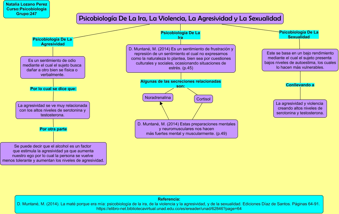 Este Cmap, tiene información relacionada con: Psicobiología De La Ira, La Violencia, La Agresividad y La Sexualidad, Psicobiología De La Ira, La Violencia, La Agresividad y La Sexualidad Psicobiología De La Agresividad Es un sentimiento de odio mediante el cual el sujeto busca dañar a otro bien se física o verbalmente., Cortisol ???? D. Muntané, M. (2014) Estas preparaciones mentales y neuromusculares nos hacen más fuertes mental y muscularmente. (p.49), Psicobiología De La Ira, La Violencia, La Agresividad y La Sexualidad Psicobiología De La Ira D. Muntané, M. (2014) Es un sentimiento de frustración y represión de un sentimiento el cual no expresamos como la naturaleza lo plantea, bien sea por cuestiones culturales y sociales, ocasionando situaciones de estrés. (p.45), D. Muntané, M. (2014) Estas preparaciones mentales y neuromusculares nos hacen más fuertes mental y muscularmente. (p.49) ???? Noradrenalina, Este se basa en un bajo rendimiento mediante el cual el sujeto presenta bajos niveles de autoestima, los cuales lo hacen más vulnerables. Conllevando a La agresividad y violencia creando altos niveles de serotonina y testosterona., La agresividad se ve muy relacionada con los altos niveles de serotonina y testosterona. Por otra parte Se puede decir que el alcohol es un factor que estimula la agresividad ya que aumenta nuestro ego por lo cual la persona se vuelve menos tolerante y aumentan los niveles de agresividad., D. Muntané, M. (2014) Es un sentimiento de frustración y represión de un sentimiento el cual no expresamos como la naturaleza lo plantea, bien sea por cuestiones culturales y sociales, ocasionando situaciones de estrés. (p.45) Algunas de las secreciones relacionadas son: Cortisol, D. Muntané, M. (2014) Es un sentimiento de frustración y represión de un sentimiento el cual no expresamos como la naturaleza lo plantea, bien sea por cuestiones culturales y sociales, ocasionando situaciones de estrés. (p.45) Algunas de las secreciones relacionadas son: Noradrenalina, Es un sentimiento de odio mediante el cual el sujeto busca dañar a otro bien se física o verbalmente. Por lo cual se dice que: La agresividad se ve muy relacionada con los altos niveles de serotonina y testosterona., Psicobiología De La Ira, La Violencia, La Agresividad y La Sexualidad Psicobiología De La Sexualidad Este se basa en un bajo rendimiento mediante el cual el sujeto presenta bajos niveles de autoestima, los cuales lo hacen más vulnerables.