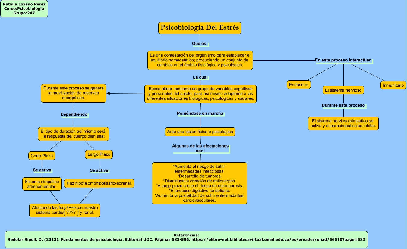Este Cmap, tiene información relacionada con: Psicobiologia del estrés, Es una contestación del organismo para establecer el equilibrio homeostático; produciendo un conjunto de cambios en el ámbito fisiológico y psicológico. La cual Busca afinar mediante un grupo de variables cognitivas y personales del sujeto, para así mismo adaptarse a las diferentes situaciones biológicas, psicológicas y sociales., Sistema simpático adrenomedular. ???? Afectando las funciones de nuestro sistema cardiovascular y renal., Durante este proceso se genera la movilización de reservas energéticas. Dependiendo El tipo de duración así mismo será la respuesta del cuerpo bien sea:, El tipo de duración así mismo será la respuesta del cuerpo bien sea: ???? Corto Plazo, El tipo de duración así mismo será la respuesta del cuerpo bien sea: ???? Largo Plazo, Busca afinar mediante un grupo de variables cognitivas y personales del sujeto, para así mismo adaptarse a las diferentes situaciones biológicas, psicológicas y sociales. Poniéndose en marcha Ante una lesión física o psicológica, Haz hipotalomohipofisario-adrenal. ???? ????, Corto Plazo Se activa Sistema simpático adrenomedular., Busca afinar mediante un grupo de variables cognitivas y personales del sujeto, para así mismo adaptarse a las diferentes situaciones biológicas, psicológicas y sociales. ???? Durante este proceso se genera la movilización de reservas energéticas., Es una contestación del organismo para establecer el equilibrio homeostático; produciendo un conjunto de cambios en el ámbito fisiológico y psicológico. En este proceso interactúan Endocrino, Es una contestación del organismo para establecer el equilibrio homeostático; produciendo un conjunto de cambios en el ámbito fisiológico y psicológico. En este proceso interactúan Inmunitario, Es una contestación del organismo para establecer el equilibrio homeostático; produciendo un conjunto de cambios en el ámbito fisiológico y psicológico. En este proceso interactúan El sistema nervioso, Ante una lesión física o psicológica Algunas de las afectaciones son: *Aumenta el riesgo de sufrir enfermedades infecciosas. *Desarrollo de tumores. *Disminuye la creación de anticuerpos. *A largo plazo crece el riesgo de osteoporosis. *El proceso digestivo se detiene. *Aumenta la posibilidad de sufrir enfermedades cardiovasculares., El sistema nervioso Durante este proceso El sistema nervioso simpático se activa y el parasimpático se inhibe., Psicobiología Del Estrés Que es: Es una contestación del organismo para establecer el equilibrio homeostático; produciendo un conjunto de cambios en el ámbito fisiológico y psicológico., Largo Plazo Se activa Haz hipotalomohipofisario-adrenal.
