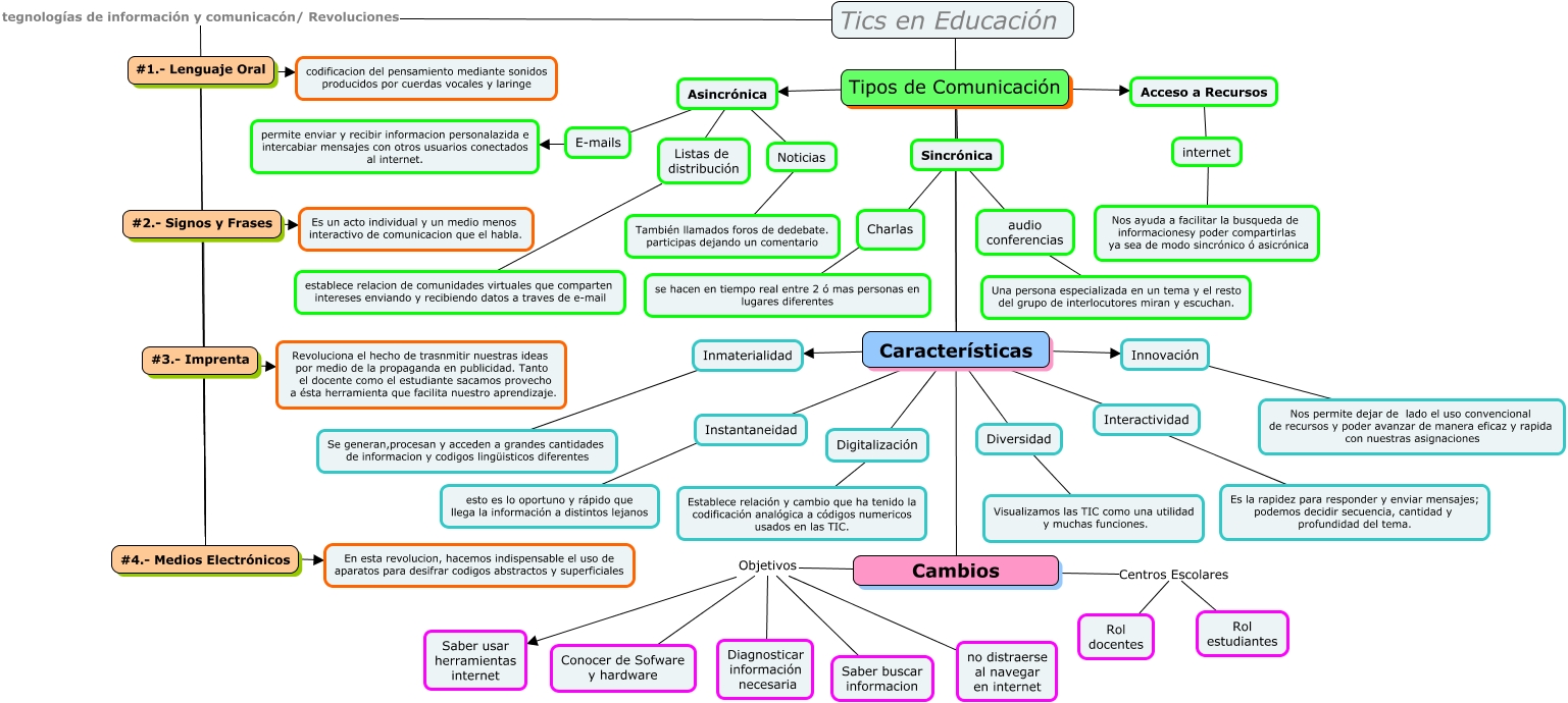 Este Cmap, tiene información relacionada con: Tics en Educacion, Tipos de Comunicación ???? Tics en Educación, internet ???? Nos ayuda a facilitar la busqueda de informacionesy poder compartirlas ya sea de modo sincrónico ó asicrónica, Cambios Objetivos Conocer de Sofware y hardware, Asincrónica ???? Noticias, #2.- Signos y Frases ???? Es un acto individual y un medio menos interactivo de comunicacion que el habla., Sincrónica ???? audio conferencias, Características ???? Innovación, Cambios Centros Escolares Rol estudiantes, Diversidad ???? Visualizamos las TIC como una utilidad y muchas funciones., Características ???? Diversidad, Tipos de Comunicación ???? Asincrónica, #4.- Medios Electrónicos ???? #2.- Signos y Frases, Inmaterialidad ???? Se generan,procesan y acceden a grandes cantidades de informacion y codigos lingüisticos diferentes, Tipos de Comunicación ???? Características, Tipos de Comunicación ???? Sincrónica, Charlas ???? se hacen en tiempo real entre 2 ó mas personas en lugares diferentes, Características ???? Interactividad, Innovación ???? Nos permite dejar de lado el uso convencional de recursos y poder avanzar de manera eficaz y rapida con nuestras asignaciones, #3.- Imprenta ???? Revoluciona el hecho de trasnmitir nuestras ideas por medio de la propaganda en publicidad. Tanto el docente como el estudiante sacamos provecho a ésta herramienta que facilita nuestro aprendizaje., Características ???? Instantaneidad