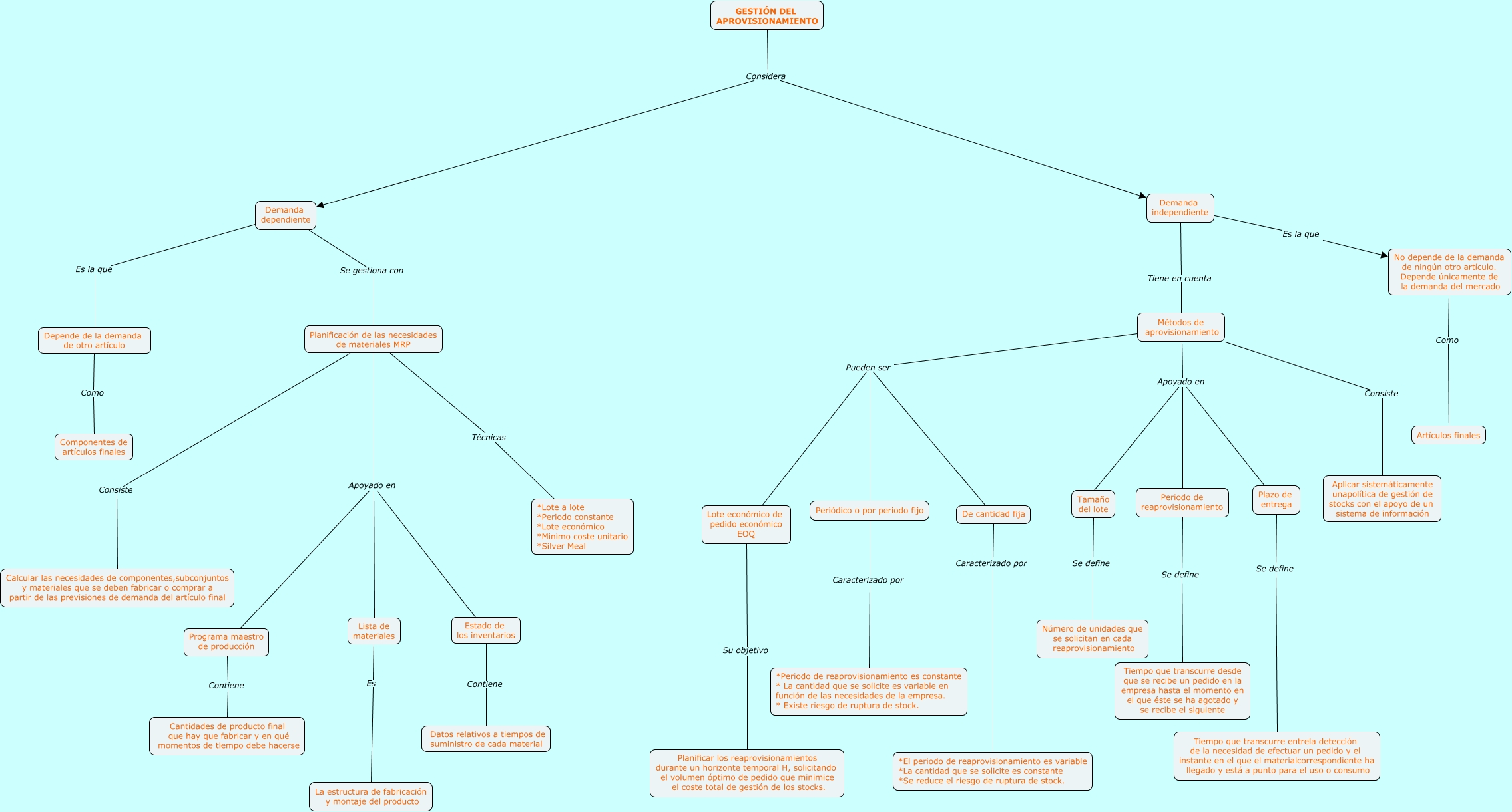 Este Cmap, tiene información relacionada con: GESTIÓN DEL APROVISIONAMIENTO, Lista de materiales Es La estructura de fabricación y montaje del producto, Métodos de aprovisionamiento Apoyado en Tamaño del lote, Planificación de las necesidades de materiales MRP Apoyado en Programa maestro de producción, Plazo de entrega Se define Tiempo que transcurre entrela detección de la necesidad de efectuar un pedido y el instante en el que el materialcorrespondiente ha llegado y está a punto para el uso o consumo, Métodos de aprovisionamiento Apoyado en Periodo de reaprovisionamiento, Métodos de aprovisionamiento Consiste Aplicar sistemáticamente unapolítica de gestión de stocks con el apoyo de un sistema de información, No depende de la demanda de ningún otro artículo. Depende únicamente de la demanda del mercado Como Artículos finales, Estado de los inventarios Contiene Datos relativos a tiempos de suministro de cada material, Planificación de las necesidades de materiales MRP Técnicas *Lote a lote *Periodo constante *Lote económico *Minimo coste unitario *Silver Meal, Lote económico de pedido económico EOQ Su objetivo Planificar los reaprovisionamientos durante un horizonte temporal H, solicitando el volumen óptimo de pedido que minimice el coste total de gestión de los stocks., Programa maestro de producción Contiene Cantidades de producto final que hay que fabricar y en qué momentos de tiempo debe hacerse, Métodos de aprovisionamiento Pueden ser De cantidad fija, Demanda independiente Es la que No depende de la demanda de ningún otro artículo. Depende únicamente de la demanda del mercado, Demanda dependiente Se gestiona con Planificación de las necesidades de materiales MRP, Métodos de aprovisionamiento Apoyado en Plazo de entrega, Periodo de reaprovisionamiento Se define Tiempo que transcurre desde que se recibe un pedido en la empresa hasta el momento en el que éste se ha agotado y se recibe el siguiente, Métodos de aprovisionamiento Pueden ser Lote económico de pedido económico EOQ, Tamaño del lote Se define Número de unidades que se solicitan en cada reaprovisionamiento, Planificación de las necesidades de materiales MRP Apoyado en Lista de materiales, Planificación de las necesidades de materiales MRP Consiste Calcular las necesidades de componentes,subconjuntos y materiales que se deben fabricar o comprar a partir de las previsiones de demanda del artículo final