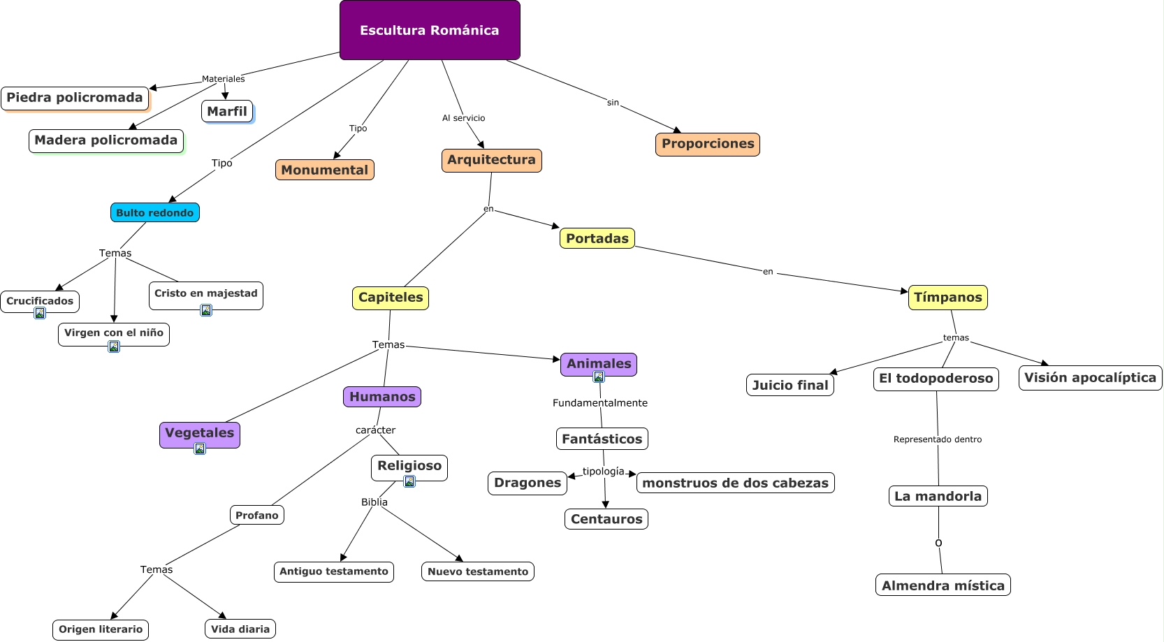 Este Cmap, tiene información relacionada con: Escultura Románica, Fantásticos tipología monstruos de dos cabezas, Capiteles Temas Animales, El todopoderoso Representado dentro La mandorla, Profano Temas Vida diaria, Religioso Biblia Nuevo testamento, Capiteles Temas Vegetales, Bulto redondo Temas Crucificados, Portadas en Tímpanos, Religioso Biblia Antiguo testamento, Escultura Románica Materiales Piedra policromada, La mandorla o Almendra mística, Tímpanos temas El todopoderoso, Escultura Románica Tipo Monumental, Tímpanos temas Juicio final, Capiteles Temas Humanos, Fantásticos tipología Centauros, Bulto redondo Temas Virgen con el niño, Escultura Románica Materiales Marfil, Escultura Románica Al servicio Arquitectura, Tímpanos temas Visión apocalíptica