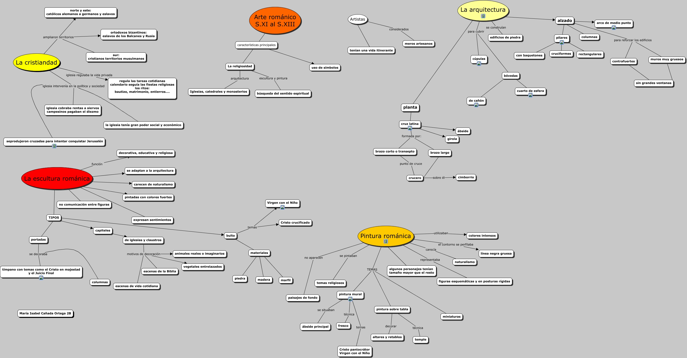 Este Cmap, tiene información relacionada con: El arte románico, cruz latina formada por: brazo largo, materiales ???? piedra, La escultura románica ???? no comunicación entre figuras, La arquitectura ???? alzado, planta ???? cruz latina, Pintura románica TEMAS pintura mural, de iglesias y claustros motivos de decoración animales reales o imaginarios, alzado ???? arco de medio punto, La cristiandad iglesia intervenía en la política y sociedad la iglesia tenía gran poder social y económico, bulto temas Virgen con el Niño, Pintura románica no aparecen paisajes de fondo, La cristiandad ampliaron territorios sur: cristianos territorios musulmanes, brazo corto o transepto punto de cruce crucero, La escultura románica ???? pintadas con colores fuertes, La cristiandad ampliaron territorios norte y este: católicos alemanos a germanos y eslavos, La escultura románica ???? se adaptan a la arquitectura, cruz latina ???? girola, contrafuertes ???? sin grandes ventanas, TIPOS ???? bulto, Pintura románica carecía naturalismo