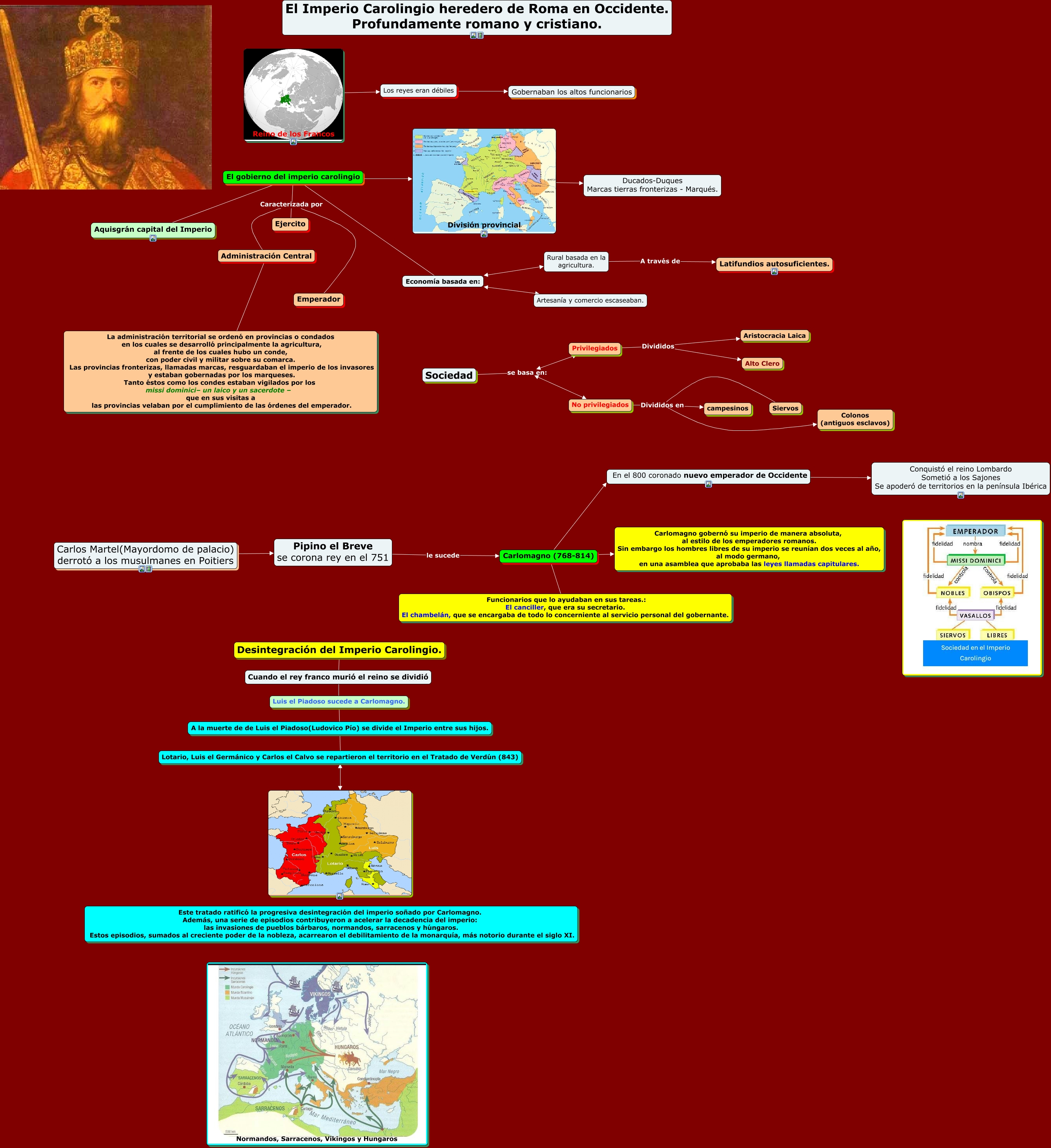 Este Cmap, tiene información relacionada con: Carlomagno mapa conceptual, Economía basada en: Artesanía y comercio escaseaban., El gobierno del imperio carolingio Caracterizada por Administración Central, No privilegiados Divididos en Siervos, El gobierno del imperio carolingio Caracterizada por Ejercito, División provincial Ducados-Duques Marcas tierras fronterizas - Marqués., El gobierno del imperio carolingio Economía basada en:, Luis el Piadoso sucede a Carlomagno. A la muerte de de Luis el Piadoso(Ludovico Pío) se divide el Imperio entre sus hijos., El gobierno del imperio carolingio Aquisgrán capital del Imperio, El gobierno del imperio carolingio División provincial, El gobierno del imperio carolingio Caracterizada por Emperador, Los reyes eran débiles Gobernaban los altos funcionarios, Carlomagno (768-814) Carlomagno gobernó su imperio de manera absoluta, al estilo de los emperadores romanos. Sin embargo los hombres libres de su imperio se reunían dos veces al año, al modo germano, en una asamblea que aprobaba las leyes llamadas capitulares., Carlomagno (768-814) En el 800 coronado nuevo emperador de Occidente, Desintegración del Imperio Carolingio. Cuando el rey franco murió el reino se dividió, Carlos Martel(Mayordomo de palacio) derrotó a los musulmanes en Poitiers Pipino el Breve se corona rey en el 751, A la muerte de de Luis el Piadoso(Ludovico Pío) se divide el Imperio entre sus hijos. Lotario, Luis el Germánico y Carlos el Calvo se repartieron el territorio en el Tratado de Verdún (843), Carlomagno (768-814) Funcionarios que lo ayudaban en sus tareas.: El canciller, que era su secretario. El chambelán, que se encargaba de todo lo concerniente al servicio personal del gobernante., Lotario, Luis el Germánico y Carlos el Calvo se repartieron el territorio en el Tratado de Verdún (843), Sociedad se basa en: No privilegiados, Economía basada en: Rural basada en la agricultura.