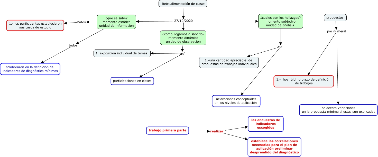 Este Cmap, tiene información relacionada con: Retroalimentación clases 27 de octubre 2020, Retroalimentación de clases 27/10/2020 ¿como llegamos a saberlo? momento dinámico unidad de observación, ¿cuales son los hallazgos? momento subjetivo unidad de análisis son 1.-una cantidad apreciable de propuestas de trabajos individuales, propuestas por numeral se acepta variaciones en la propuesta mínima si estas son explicadas, ¿cuales son los hallazgos? momento subjetivo unidad de análisis son aclaraciones conceptuales en los niveles de aplicación, trabajo primera parte realizar las encuestas de indicadores escogidos, ¿que se sabe? momento estático unidad de información Datos 1.- los participantes establecieron sus casos de estudio, trabajo primera parte realizar establece las correlaciones necesarias para el plan de aplicación preliminar desprendido del diagnóstico, Retroalimentación de clases 27/10/2020 ¿que se sabe? momento estático unidad de información, ¿como llegamos a saberlo? momento dinámico unidad de observación así 1. exposición individual de temas, ¿como llegamos a saberlo? momento dinámico unidad de observación así participaciones en clases, Retroalimentación de clases 27/10/2020 ¿cuales son los hallazgos? momento subjetivo unidad de análisis, propuestas por numeral 1.- hoy, último plazo de definición de trabajos, ¿que se sabe? momento estático unidad de información todos colaboraron en la definición de indicadores de diagnóstico mínimos