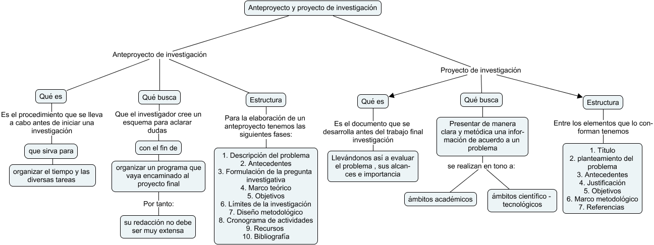 Este Cmap, tiene información relacionada con: Diseño de proyectos de investigación, Qué es Es el procedimiento que se lleva a cabo antes de iniciar una investigación que sirva para, Presentar de manera clara y metódica una infor- mación de acuerdo a un problema se realizan en tono a: ámbitos académicos, que sirva para ???? organizar el tiempo y las diversas tareas, Anteproyecto y proyecto de investigación Proyecto de investigación Qué busca, Anteproyecto y proyecto de investigación Anteproyecto de investigación Estructura, Anteproyecto y proyecto de investigación Proyecto de investigación Qué es, organizar un programa que vaya encaminado al proyecto final Por tanto: su redacción no debe ser muy extensa, Estructura Para la elaboración de un anteproyecto tenemos las siguientes fases: 1. Descripción del problema 2. Antecedentes 3. Formulación de la pregunta investigativa 4. Marco teórico 5. Objetivos 6. Límites de la investigación 7. Diseño metodológico 8. Cronograma de actividades 9. Recursos 10. Bibliografía, Qué busca ???? Presentar de manera clara y metódica una infor- mación de acuerdo a un problema, Anteproyecto y proyecto de investigación Anteproyecto de investigación Qué es, Qué es Es el documento que se desarrolla antes del trabajo final investigación Llevándonos así a evaluar el problema , sus alcan- ces e importancia, Presentar de manera clara y metódica una infor- mación de acuerdo a un problema se realizan en tono a: ámbitos científico - tecnológicos, Estructura Entre los elementos que lo con- forman tenemos 1. Título 2. planteamiento del problema 3. Antecedentes 4. Justificación 5. Objetivos 6. Marco metodológico 7. Referencias, Anteproyecto y proyecto de investigación Anteproyecto de investigación Qué busca, Anteproyecto y proyecto de investigación Proyecto de investigación Estructura, con el fin de ???? organizar un programa que vaya encaminado al proyecto final, Qué busca Que el investigador cree un esquema para aclarar dudas con el fin de