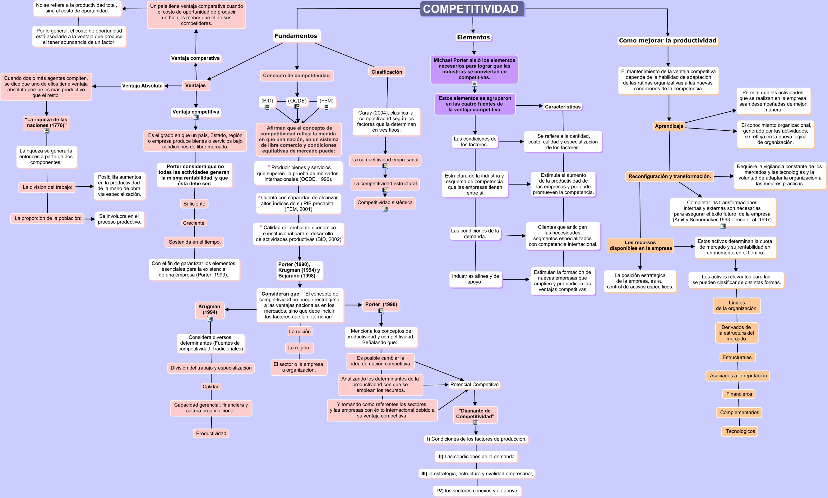 Este Cmap, tiene información relacionada con: Competitividad (Tomasa), Financieros ???? Complementarios, Los activos relevantes para las se pueden clasificar de distintas formas. ???? Límites de la organización., La región ???? El sector o la empresa u organización., Estructurales. ???? Asociados a la reputación, La división del trabajo: ???? Posibilita aumentos en la productividad de la mano de obra vía especialización., Porter (1990) Menciona los conceptos de productividad y competitividad, Señalando que: Es posible cambiar la idea de nación competitiva., Estos elementos se agruparon en las cuatro fuentes de la ventaja competitiva. Características Se refiere a la cantidad, costo, calidad y especialización de los factores., Ventajas Ventaja comparativa Un país tiene ventaja comparativa cuando el costo de oportunidad de producir un bien es menor que el de sus competidores., Consideran que: "El concepto de competitividad no puede restringirse a las ventajas nacionales en los mercados, sino que debe incluir los factores que la determinan": ???? Krugman (1994), COMPETITIVIDAD Elementos Michael Porter aisló los elementos necesarios para lograr que las industrias se conviertan en competitivas., Reconfiguración y transformación. Los recursos disponibles en la empresa Estos activos determinan la cuota de mercado y su rentabilidad en un momento en el tiempo., Analizando los determinantes de la productividad con que se emplean los recursos. ???? Y tomando como referentes los sectores y las empresas con éxito internacional debido a su ventaja competitiva., COMPETITIVIDAD Como mejorar la productividad El mantenimiento de la ventaja competitiva depende de la habilidad de adaptación de las rutinas organizativas a las nuevas condiciones de la competencia., "Diamante de Competitividad" I) Condiciones de los factores de producción. II) Las condiciones de la demanda, El mantenimiento de la ventaja competitiva depende de la habilidad de adaptación de las rutinas organizativas a las nuevas condiciones de la competencia. Aprendizaje El conocimiento organizacional, generado por las actividades, se refleja en la nueva lógica de organización., Estructura de la industria y esquema de competencia que las empresas tienen entre sí. Las condiciones de la demanda. Clientes que anticipan las necesidades, segmentos especializados con competencia internacional., Cuando dos o más agentes compiten, se dice que uno de ellos tiene ventaja absoluta porque es más productivo que el resto. "La riqueza de las naciones (1776)" La riqueza se generaría entonces a partir de dos componentes:, (FEM) ???? Afirman que el concepto de competitividad refleja la medida en que una nación, en un sistema de libre comercio y condiciones equitativas de mercado puede:, Clasificación ???? Garay (2004), clasifica la competitividad según los factores que la determinan en tres tipos:, Derivados de la estructura del mercado. ???? Estructurales.