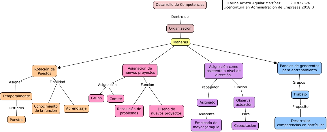 Este Cmap, tiene información relacionada con: 3.2 desarrollo de competencias dentro de la organización, Rotación de Puestos Asignar Temporalmente, Trabajo Proposito Desarrollar competencias en partícular, Maneras ???? Rotación de Puestos, Maneras ???? Paneles de generentes para entrenamiento, Organización ???? Maneras, Temporalmente Distintos Puestos, Maneras ???? Asignación como asistente a nivel de dirección., Asignación de nuevos proyectos Función Diseño de nuevos proyectos, Asignación de nuevos proyectos Asignación Grupo, Asignación como asistente a nivel de dirección. Trabajador Asignado, Rotación de Puestos Finalidad Aprendizaje, Observar actuación Para Capacitación, Asignación de nuevos proyectos Asignación Comité, Maneras ???? Asignación de nuevos proyectos, Asignado Asistente Empleado de mayor jeraquia, Asignación de nuevos proyectos Función Resolución de problemas, Desarrollo de Competencias Dentro de Organización, Asignación como asistente a nivel de dirección. Función Observar actuación, Rotación de Puestos Finalidad Conocimiento de la función, Paneles de generentes para entrenamiento Grupos Trabajo