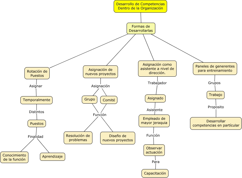 Este Cmap, tiene información relacionada con: 3.2 desarrollo de competencias dentro de la organización_DF, Rotación de Puestos Asignar Temporalmente, Trabajo Proposito Desarrollar competencias en partícular, Formas de Desarrollarlas ???? Rotación de Puestos, Formas de Desarrollarlas ???? Paneles de generentes para entrenamiento, Temporalmente Distintos Puestos, Formas de Desarrollarlas ???? Asignación como asistente a nivel de dirección., Comité Función Resolución de problemas, Grupo Función Resolución de problemas, Empleado de mayor jeraquia Función Observar actuación, Puestos Finalidad Aprendizaje, Asignación de nuevos proyectos Asignación Grupo, Asignación como asistente a nivel de dirección. Trabajador Asignado, Observar actuación Para Capacitación, Asignación de nuevos proyectos Asignación Comité, Formas de Desarrollarlas ???? Desarrollo de Competencias Dentro de la Organización, Formas de Desarrollarlas ???? Asignación de nuevos proyectos, Puestos Finalidad Conocimiento de la función, Asignado Asistente Empleado de mayor jeraquia, Grupo Función Diseño de nuevos proyectos, Paneles de generentes para entrenamiento Grupos Trabajo