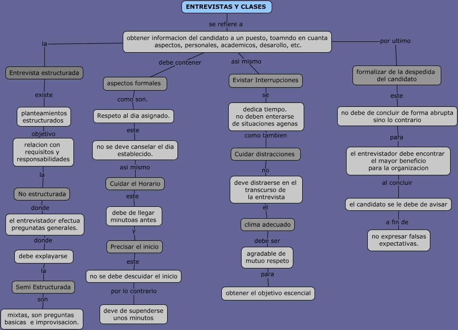 Este Cmap, tiene información relacionada con: 5 5 entrevitas y clases, relacion con requisitos y responsabilidades la No estructurada, Precisar el inicio este no se debe descuidar el inicio, No estructurada donde el entrevistador efectua pregunatas generales., debe de llegar minutoas antes y Precisar el inicio, el entrevistador debe encontrar el mayor beneficio para la organizacion al concluir el candidato se le debe de avisar, aspectos formales como son. Respeto al dia asignado., Evistar Interrupciones se dedica tiempo. no deben enterarse de situaciones agenas, obtener informacion del candidato a un puesto, toamndo en cuanta aspectos, personales, academicos, desarollo, etc. por ultimo formalizar de la despedida del candidato, obtener informacion del candidato a un puesto, toamndo en cuanta aspectos, personales, academicos, desarollo, etc. debe contener aspectos formales, el candidato se le debe de avisar a fin de no expresar falsas expectativas., planteamientos estructurados objetivo relacion con requisitos y responsabilidades, el entrevistador efectua pregunatas generales. donde debe explayarse, Semi Estructurada son mixtas, son preguntas basicas e improvisacion., no se debe descuidar el inicio por lo contrario deve de supenderse unos minutos, debe explayarse la Semi Estructurada, Cuidar distracciones no deve distraerse en el transcurso de la entrevista, formalizar de la despedida del candidato este no debe de concluir de forma abrupta sino lo contrario, Entrevista estructurada existe planteamientos estructurados, dedica tiempo. no deben enterarse de situaciones agenas como tambien Cuidar distracciones, deve distraerse en el transcurso de la entrevista el clima adecuado