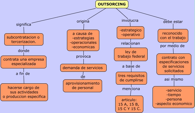 Este Cmap, tiene información relacionada con: 5 7 OUTSORCING, OUTSORCING origina a causa de -estrategias -operacionales -economicas, reconocido con el trabajo por medio de contrato con especificaciones de servicios solicitados, contrata una empresa especializada a fin de hacerse cargo de sus actividades o produccion especifica, OUTSORCING significa subcontratacion o tercerizacion., demanda de servicios de aprovisionamiento de personal, -estrategico -operativo relacionan ley de trabajo federal, ley de trabajo federal a base de tres requisitos de cumplirse, OUTSORCING involucra -estrategico -operativo, contrato con especificaciones de servicios solicitados asi mismo -servicio -tiempo -persona -aspecto economico, OUTSORCING debe estar reconocido con el trabajo, tres requisitos de cumplirse menciona articulo: 15 A, 15 B, 15 C Y 15 C., subcontratacion o tercerizacion. donde contrata una empresa especializada, a causa de -estrategias -operacionales -economicas provoca demanda de servicios