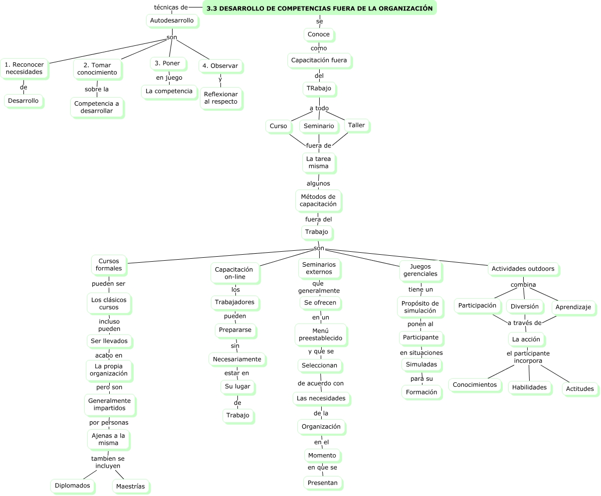 Este Cmap, tiene información relacionada con: 3.3.0, TRabajo a todo Taller, Trabajo son Cursos formales, Autodesarrollo son 4. Observar, Menú preestablecido y que se Seleccionan, Prepararse sin Necesariamente, Actividades outdoors combina Aprendizaje, La acción el participante incorpora Habilidades, Curso fuera de La tarea misma, Ser llevados acabo en La propia organización, 4. Observar y Reflexionar al respecto, Participación a través de La acción, Diversión a través de La acción, Trabajo son Seminarios externos, 2. Tomar conocimiento sobre la Competencia a desarrollar, Conoce como Capacitación fuera, La acción el participante incorpora Actitudes, Necesariamente estar en Su lugar, Actividades outdoors combina Participación, Métodos de capacitación fuera del Trabajo, Momento en que se Presentan