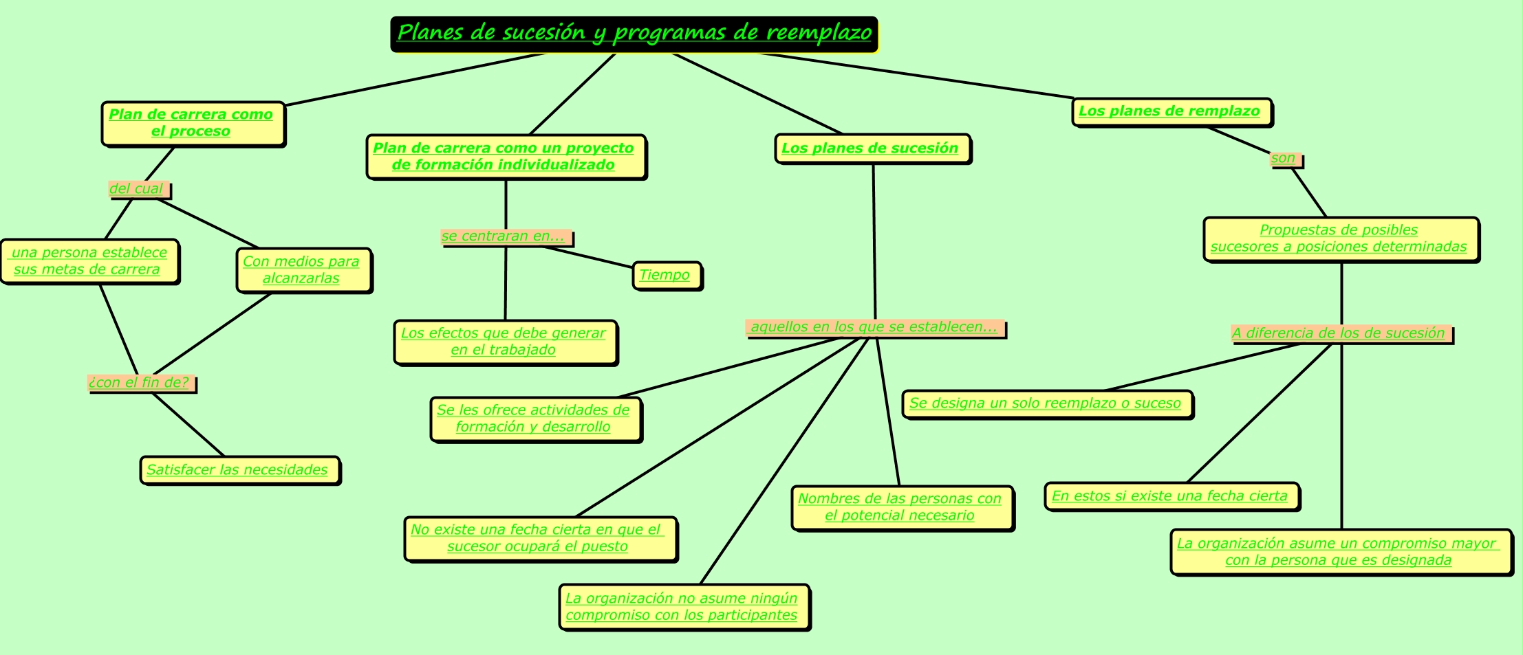 Este Cmap, tiene información relacionada con: 3.4.1. Planes de sucesión y programas de reemplazo, Los planes de sucesión aquellos en los que se establecen... Nombres de las personas con el potencial necesario, Plan de carrera como un proyecto de formación individualizado se centraran en... Los efectos que debe generar en el trabajado, Los planes de sucesión aquellos en los que se establecen... La organización no asume ningún compromiso con los participantes, una persona establece sus metas de carrera ¿con el fin de? Satisfacer las necesidades, Propuestas de posibles sucesores a posiciones determinadas A diferencia de los de sucesión La organización asume un compromiso mayor con la persona que es designada, Plan de carrera como un proyecto de formación individualizado Planes de sucesión y programas de reemplazo Plan de carrera como el proceso, Propuestas de posibles sucesores a posiciones determinadas A diferencia de los de sucesión En estos si existe una fecha cierta, Los planes de remplazo son Propuestas de posibles sucesores a posiciones determinadas, Propuestas de posibles sucesores a posiciones determinadas A diferencia de los de sucesión Se designa un solo reemplazo o suceso, Plan de carrera como el proceso del cual Con medios para alcanzarlas, Con medios para alcanzarlas ¿con el fin de? Satisfacer las necesidades, Plan de carrera como un proyecto de formación individualizado se centraran en... Tiempo, Los planes de sucesión aquellos en los que se establecen... No existe una fecha cierta en que el sucesor ocupará el puesto, Plan de carrera como el proceso del cual una persona establece sus metas de carrera, Los planes de sucesión aquellos en los que se establecen... Se les ofrece actividades de formación y desarrollo, Plan de carrera como un proyecto de formación individualizado Planes de sucesión y programas de reemplazo Los planes de sucesión, Plan de carrera como un proyecto de formación individualizado Planes de sucesión y programas de reemplazo Los planes de remplazo